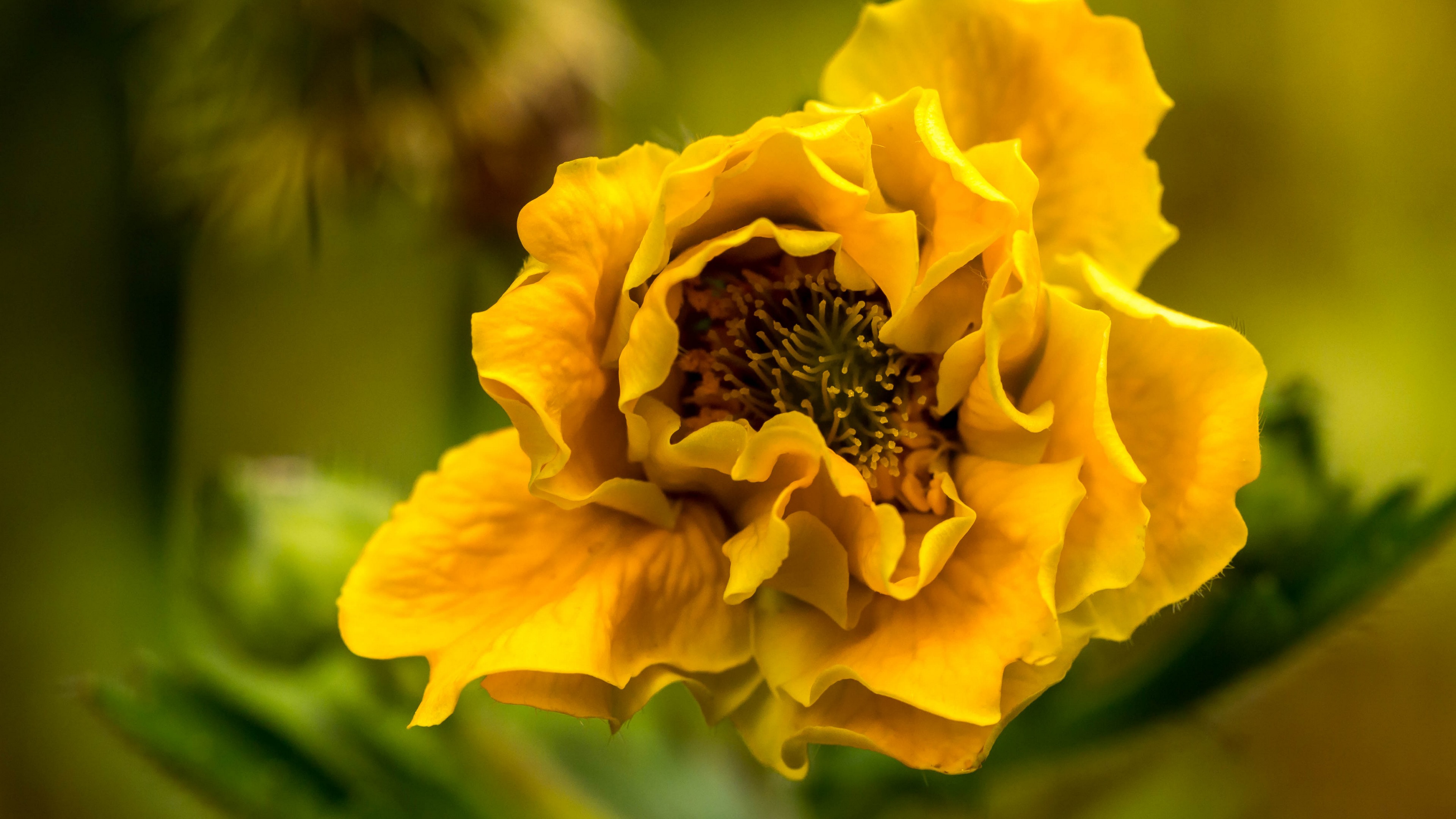 Description: A yellow flower with a green background and a blurry image of a flower in the background with a blurry background.
