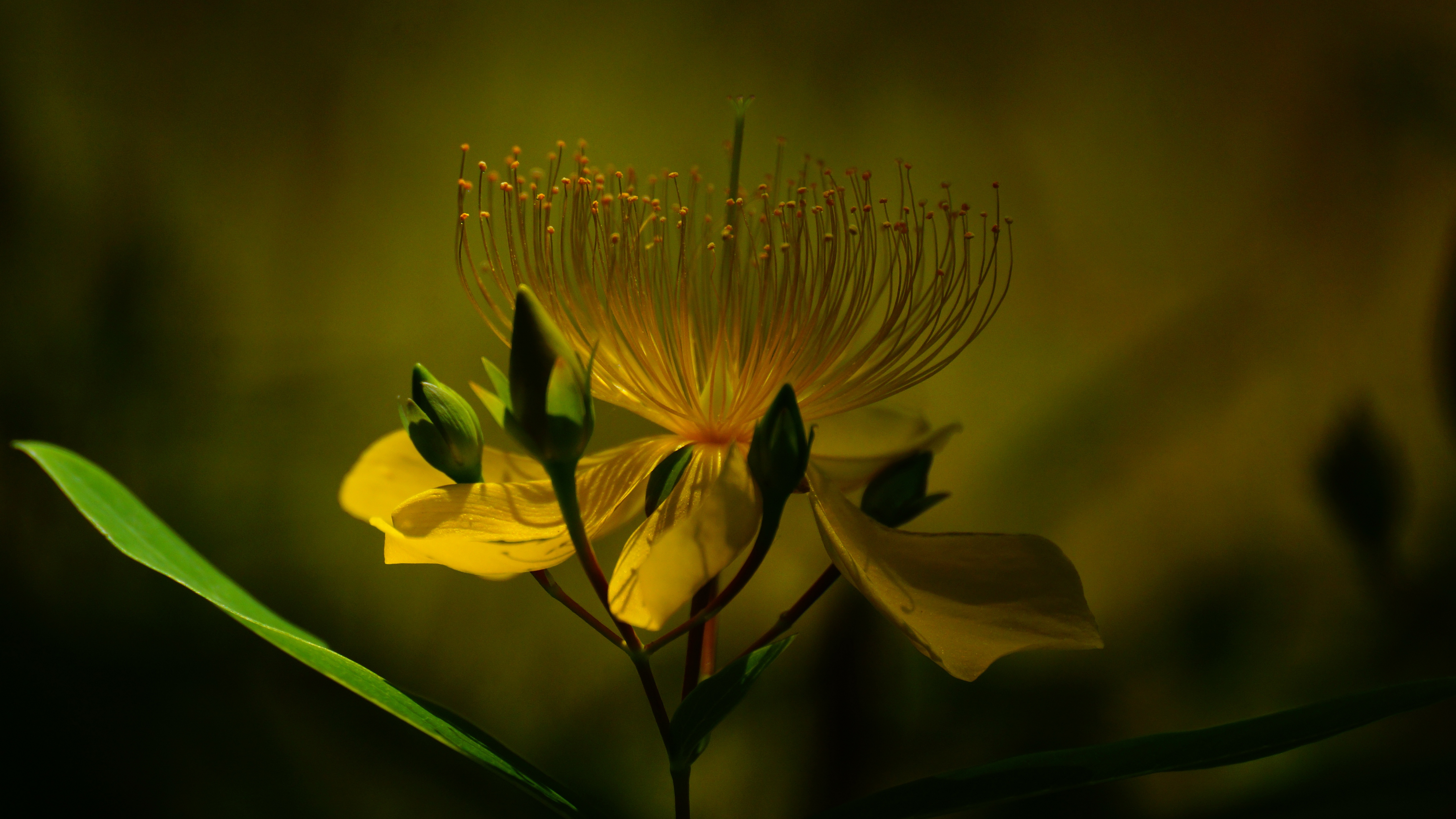 Description: A yellow flower with green leaves on a dark background with a blurry background of the flower and the leaves.