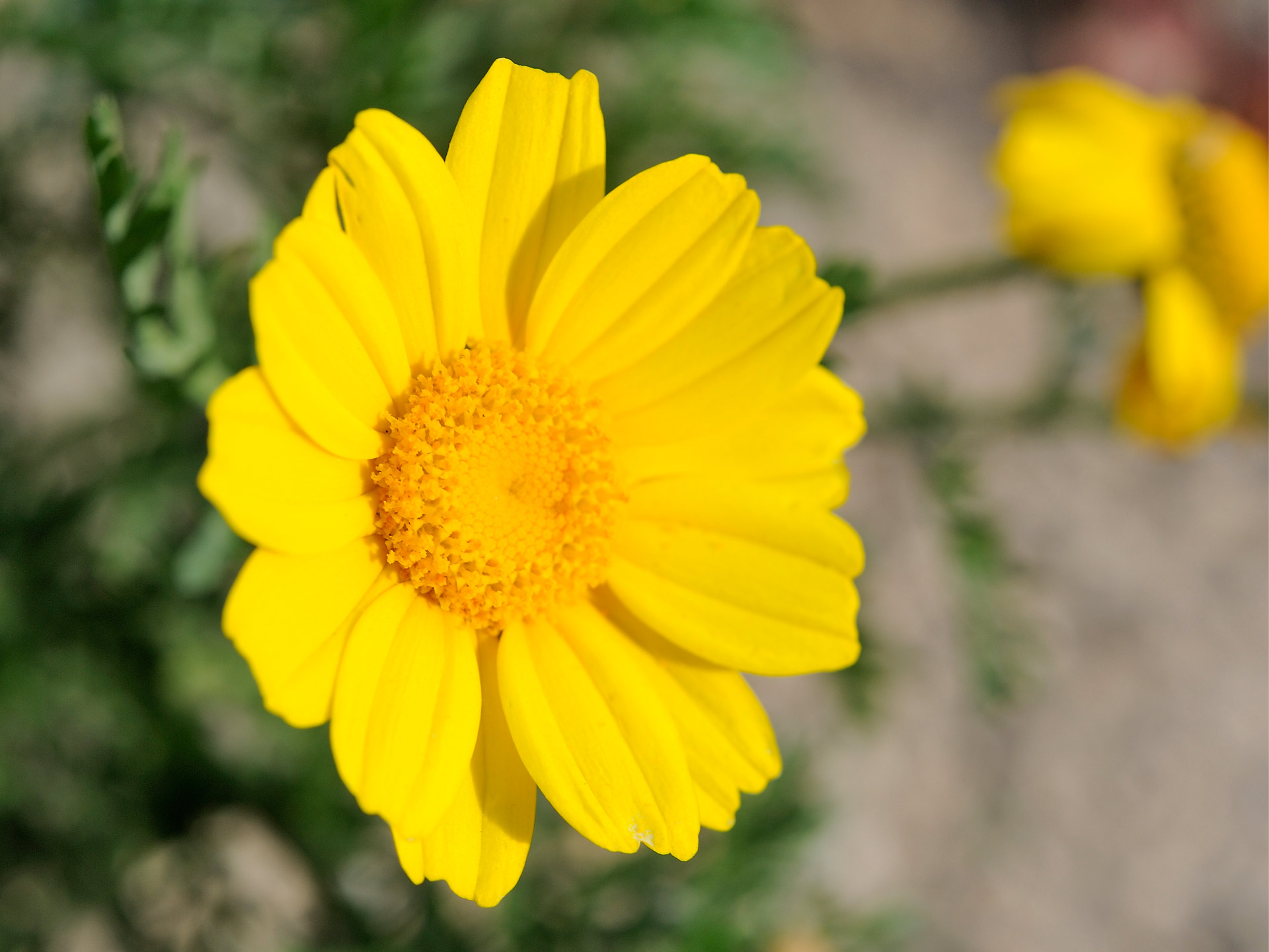 Description: A yellow flower with a green stem in the background and a blurry background behind it.