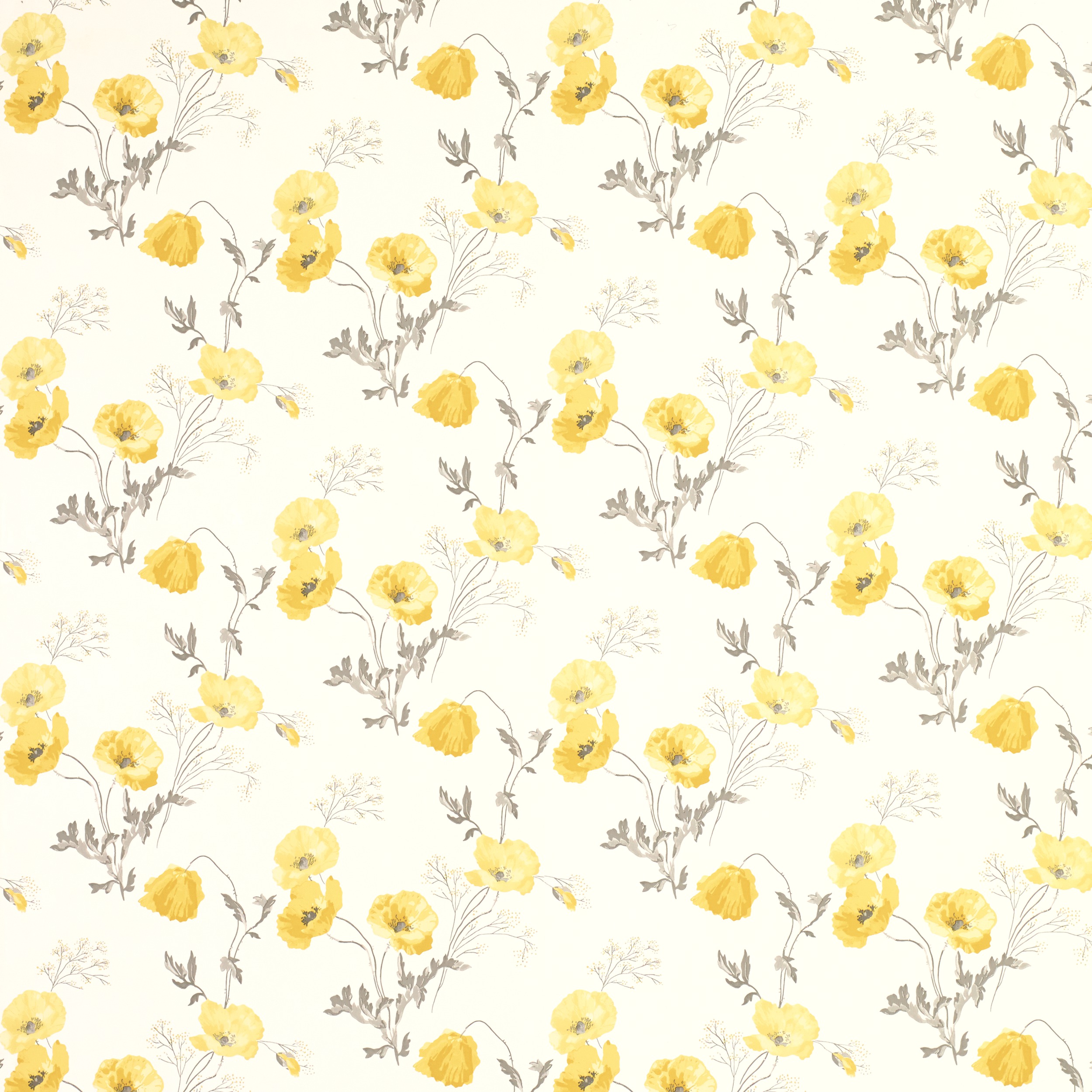 Description: A yellow flower pattern on a white background with grey leaves and stems on it.