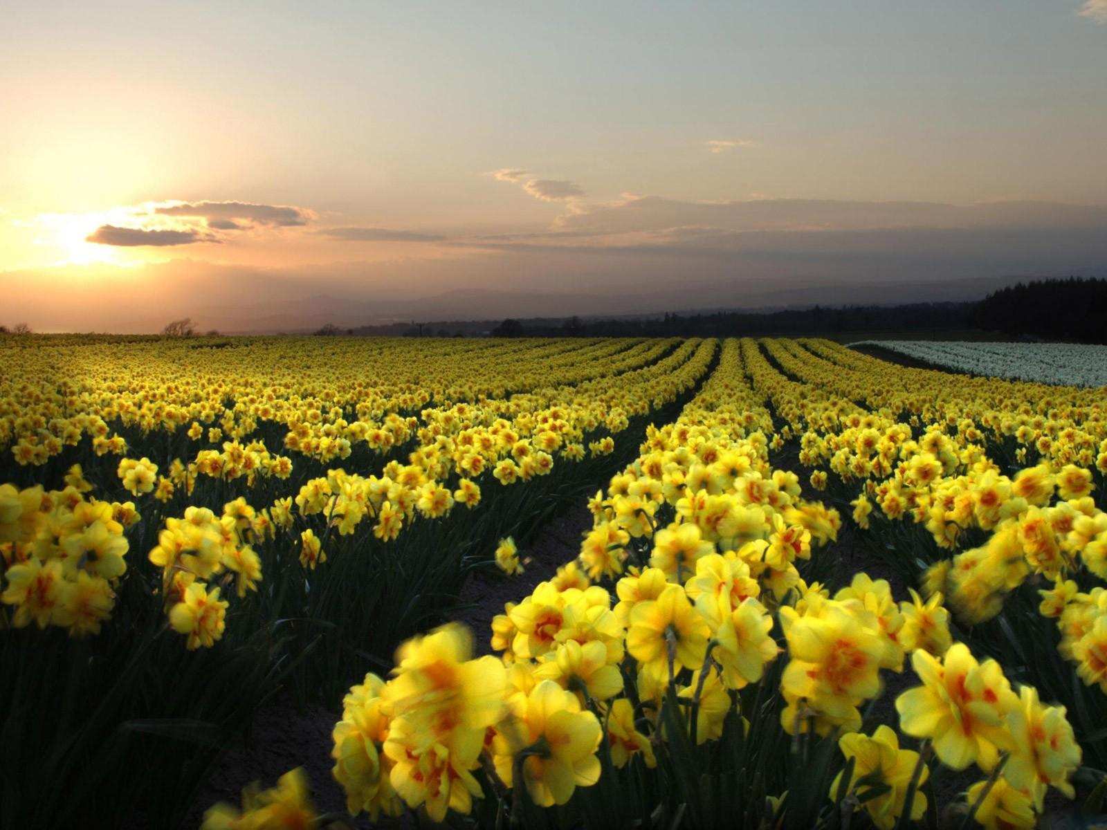 Description: A field of yellow flowers with the sun setting in the background and a field of green grass in the foreground.