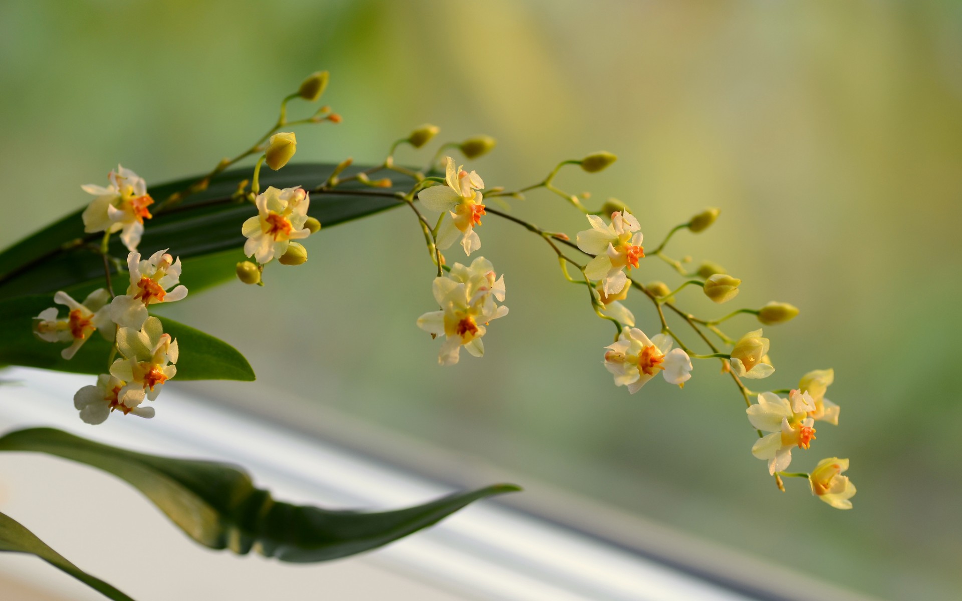 Description: A plant with yellow flowers in a vase on a window sill with a blurry background of green leaves.