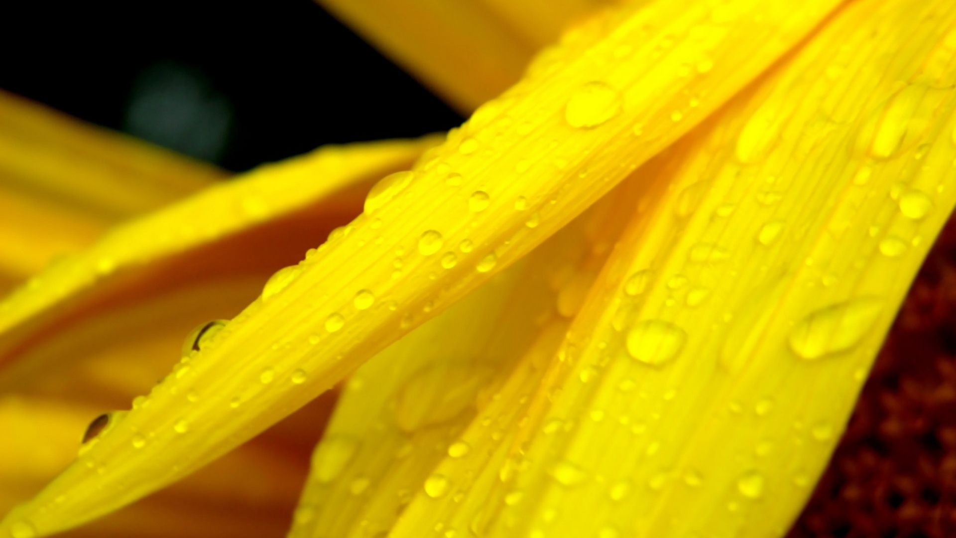 Description: A close up of a yellow flower with water droplets on it's petals and a black background with a black background.