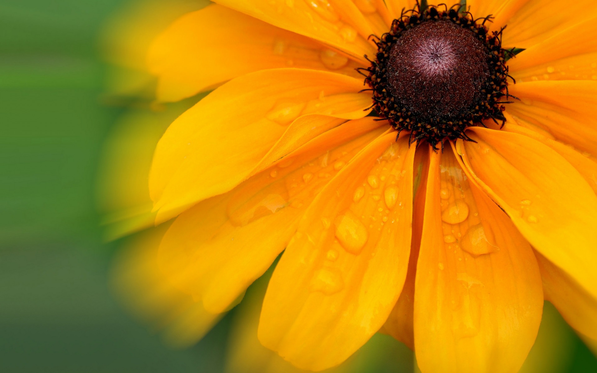 Description: A yellow flower with water droplets on it's petals and a green background with a blurry background.