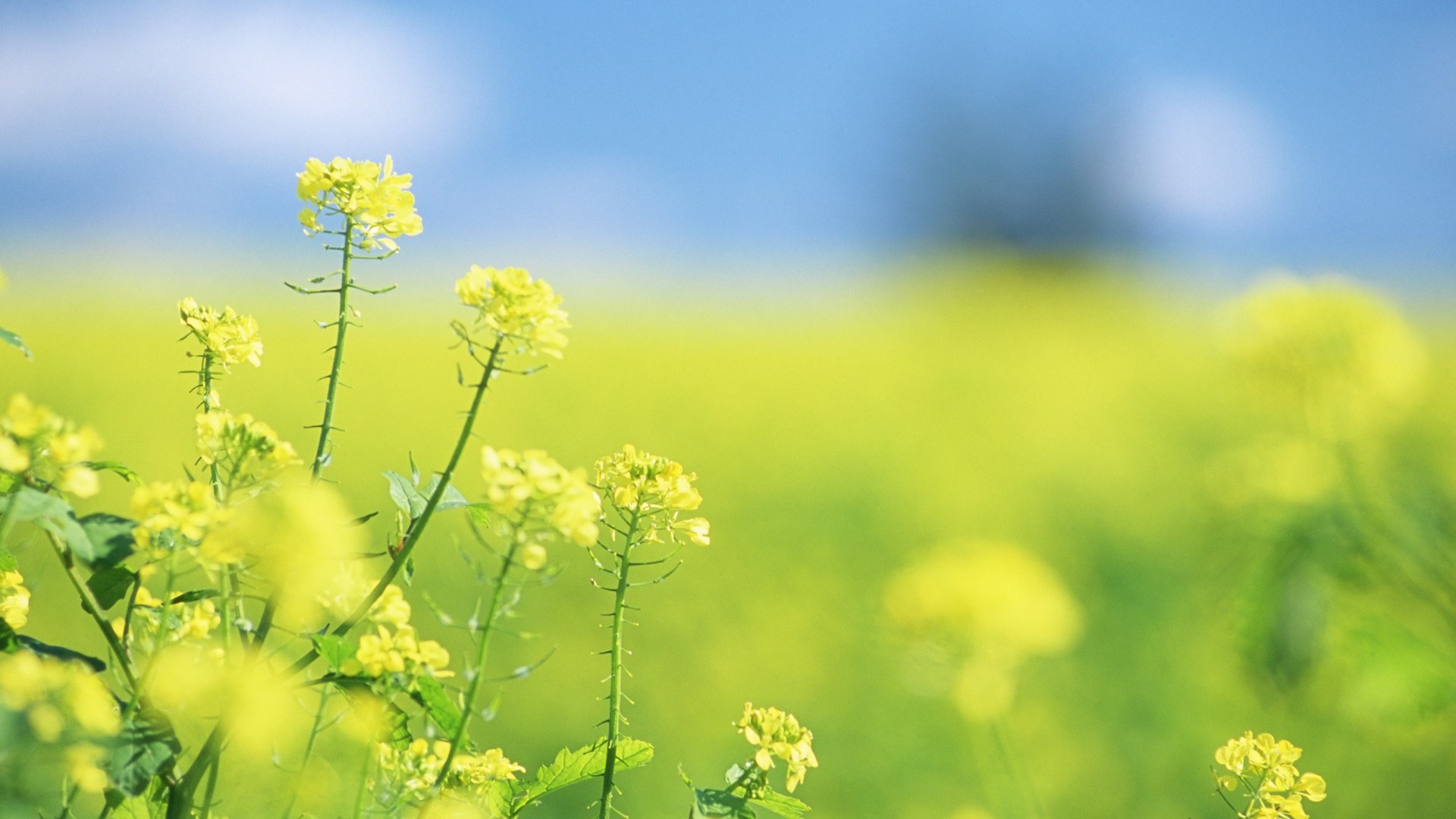 Description: A field of yellow flowers with a blue sky in the background and a blurry background of grass and flowers.