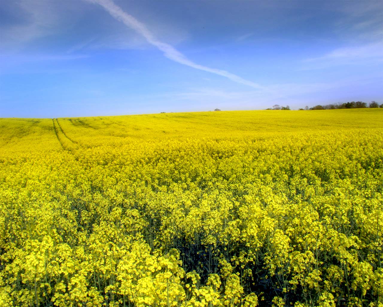 Description: A field of yellow flowers under a blue sky with clouds in the background and a blue sky with wispy clouds.
