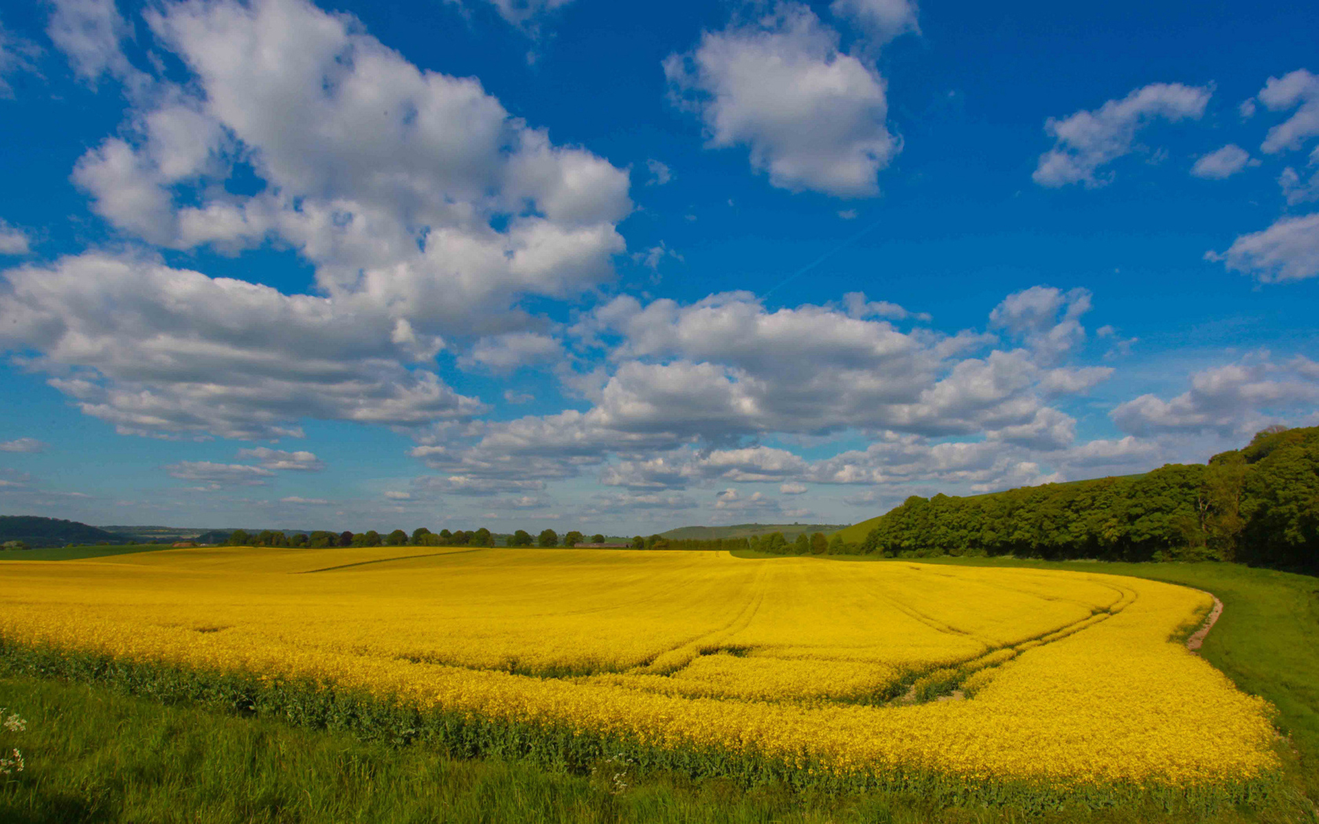 Description: A field of yellow flowers under a blue sky with clouds above it and a path in the middle of the field.