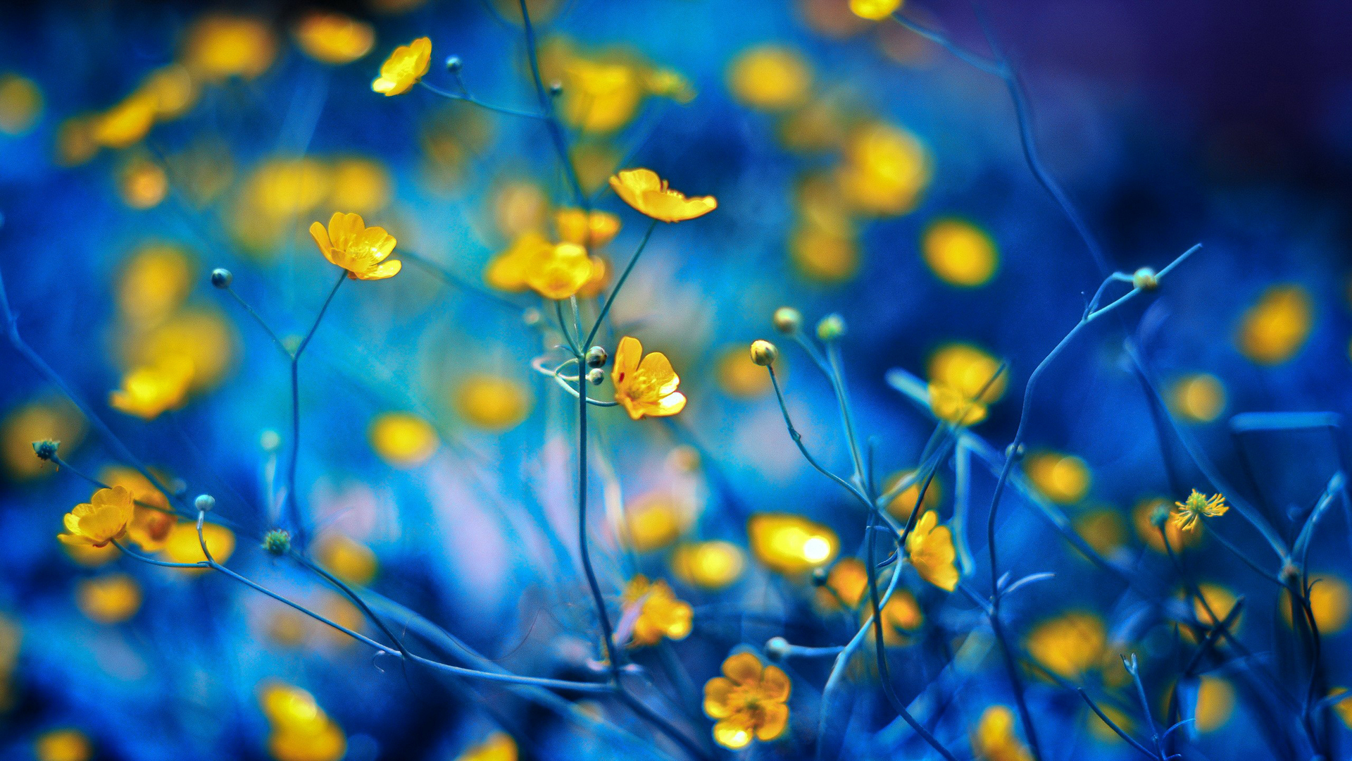 Description: A bunch of yellow flowers that are in the grass with blue background and yellow flowers in the foreground.