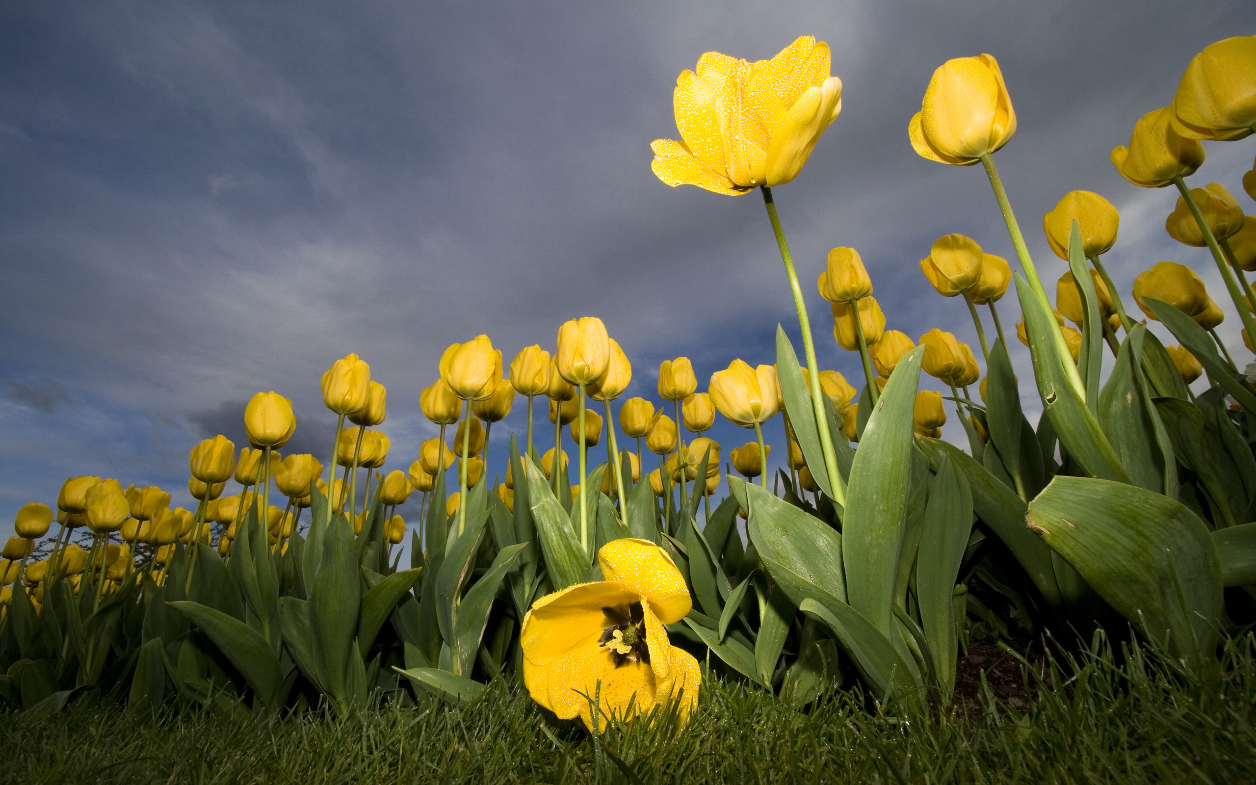 Description: A field of yellow flowers with a cloudy sky in the background.