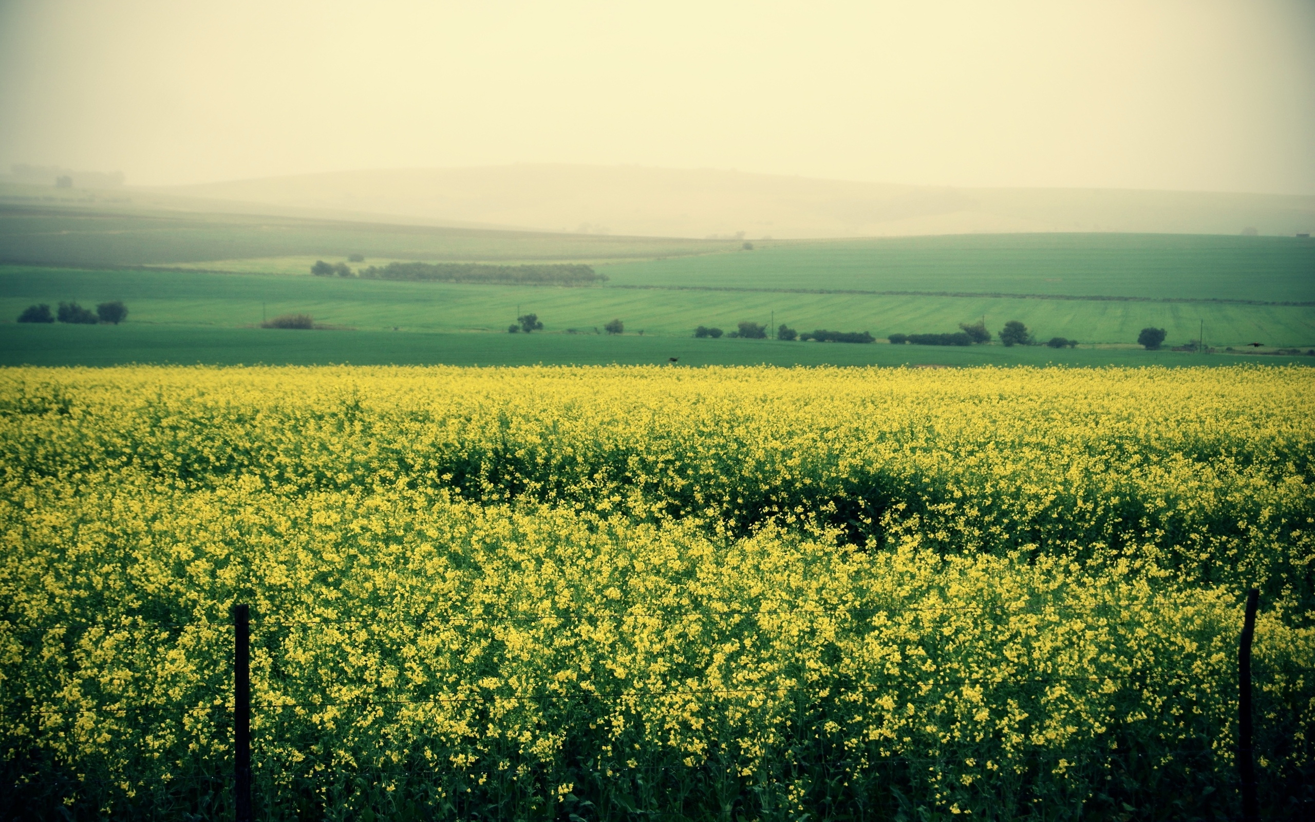 Description: A field of yellow flowers with a fence in the foreground and a distant green field in the background.