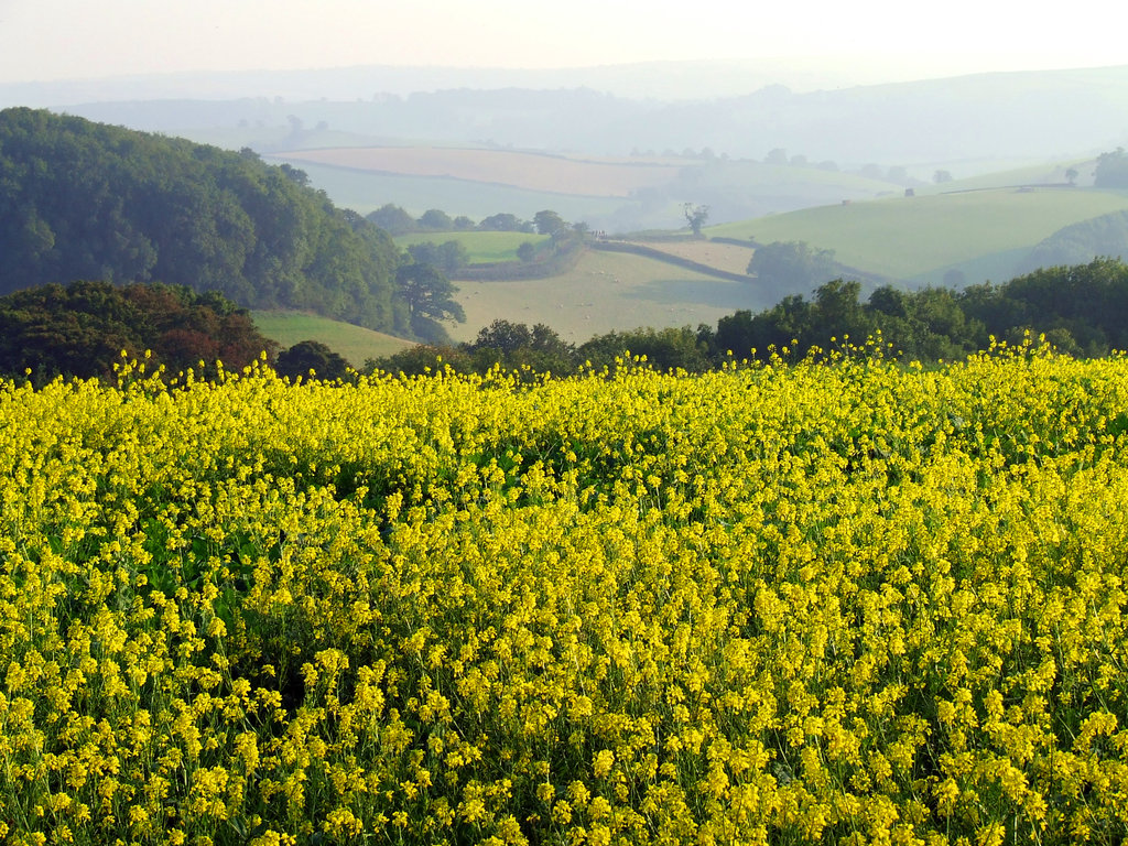 Description: A field of yellow flowers with hills in the background and foggy sky in the distance.