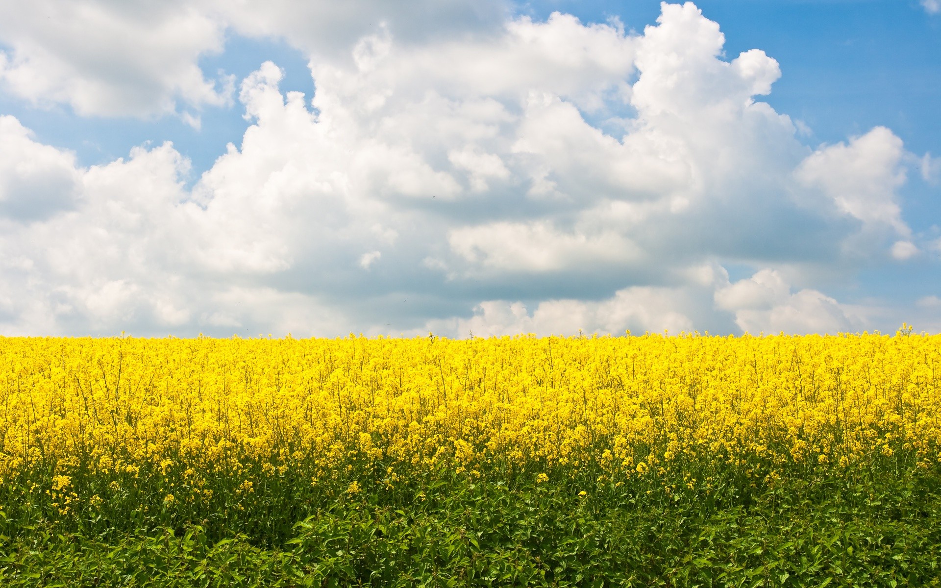 Description: A field of yellow flowers under a cloudy sky with clouds in the background.