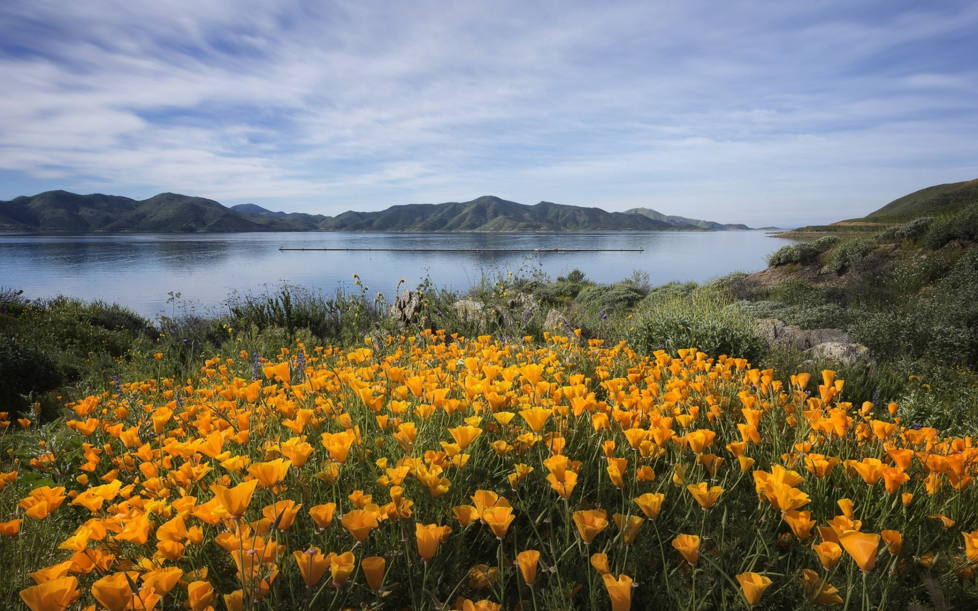 Description: A field of yellow flowers next to a lake with mountains in the background and a boat in the water.