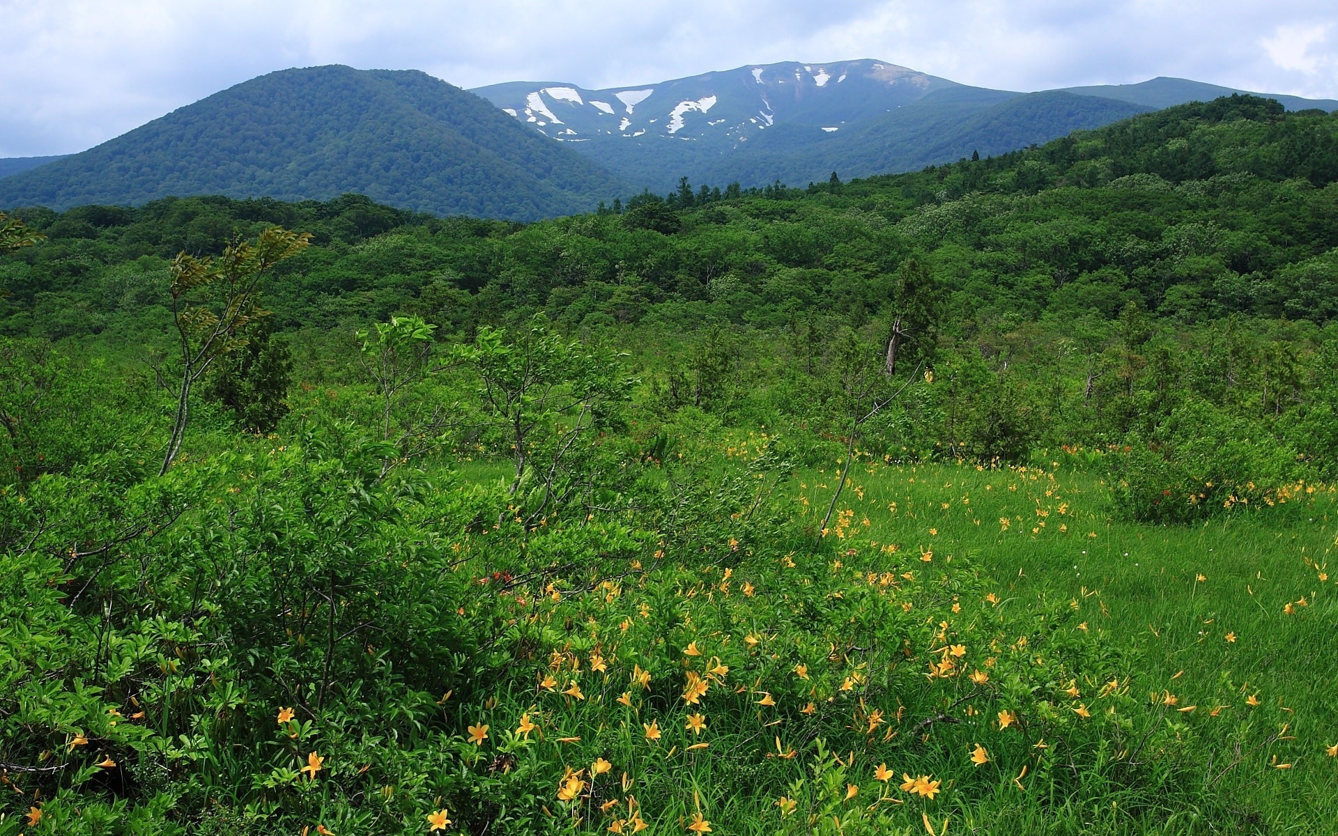 Description: A field with yellow flowers and mountains in the background with clouds in the sky above it and a blue sky with white clouds.