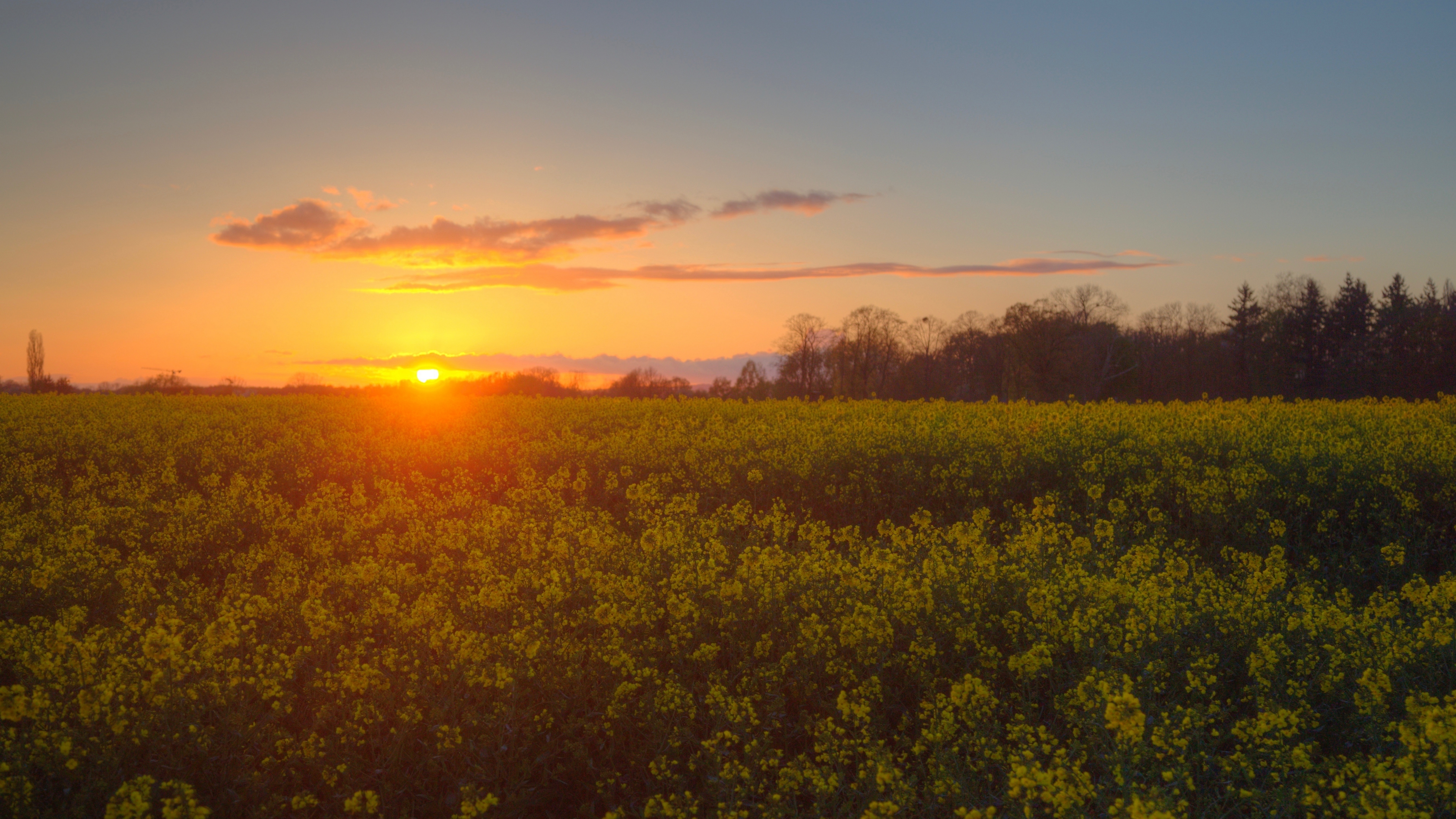 Description: A field of yellow flowers with the sun setting in the background and clouds in the sky above it.