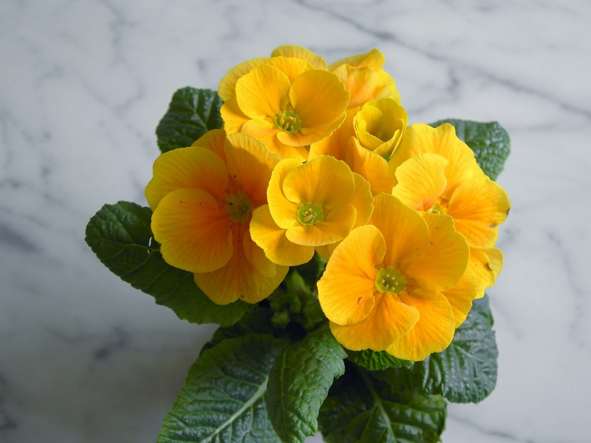 Description: A bunch of yellow flowers sitting on top of a table next to a marble wall and flooring area.