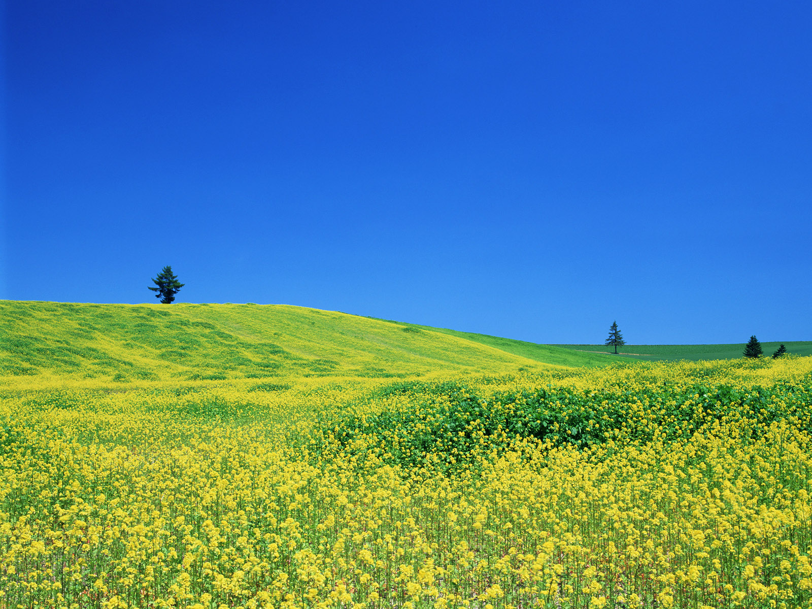 Description: A field of yellow flowers with a tree on a hill in the background with a blue sky in the background.