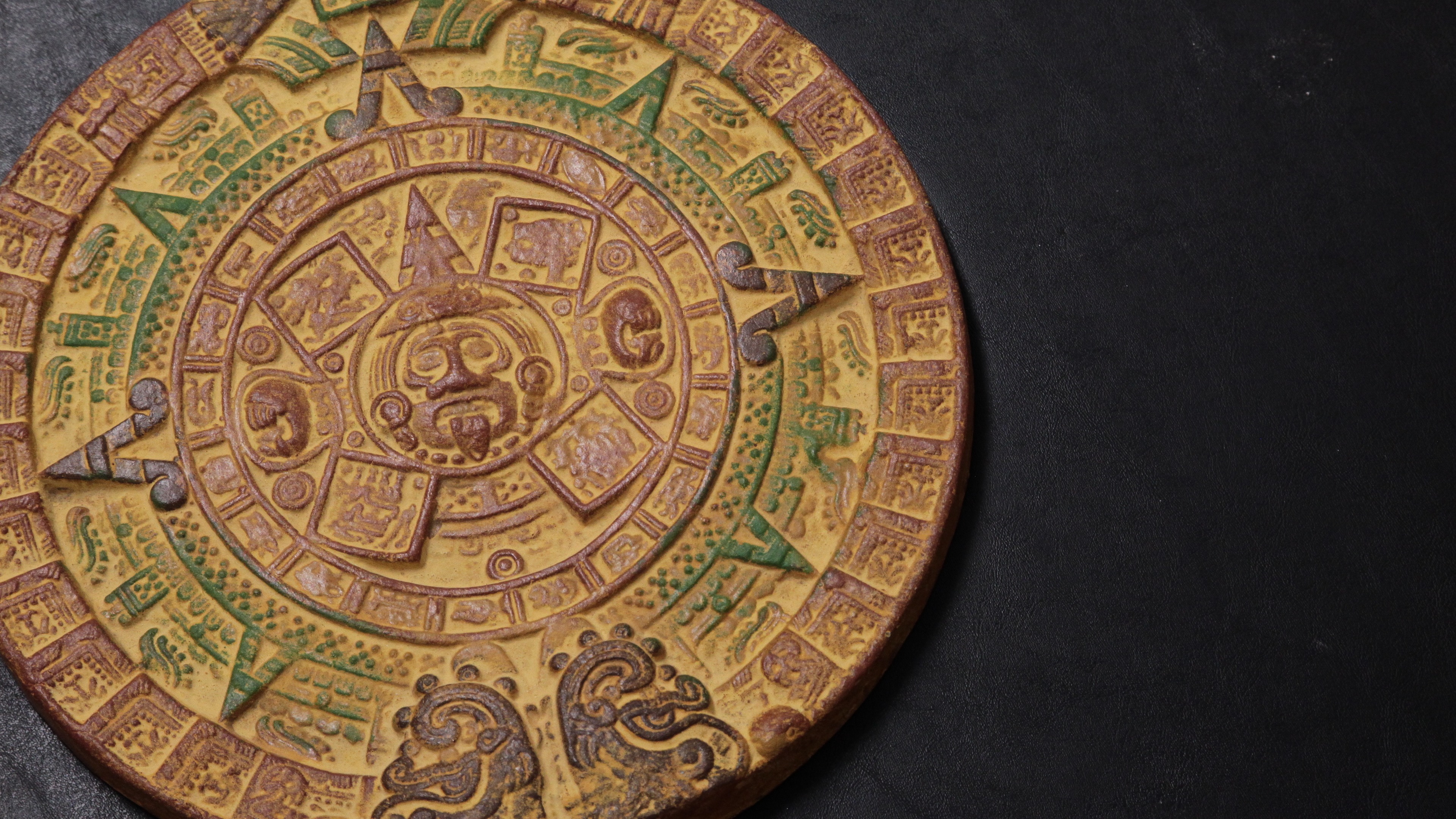Description: A yellow and green circular object with a design on it's side and a black background behind it.