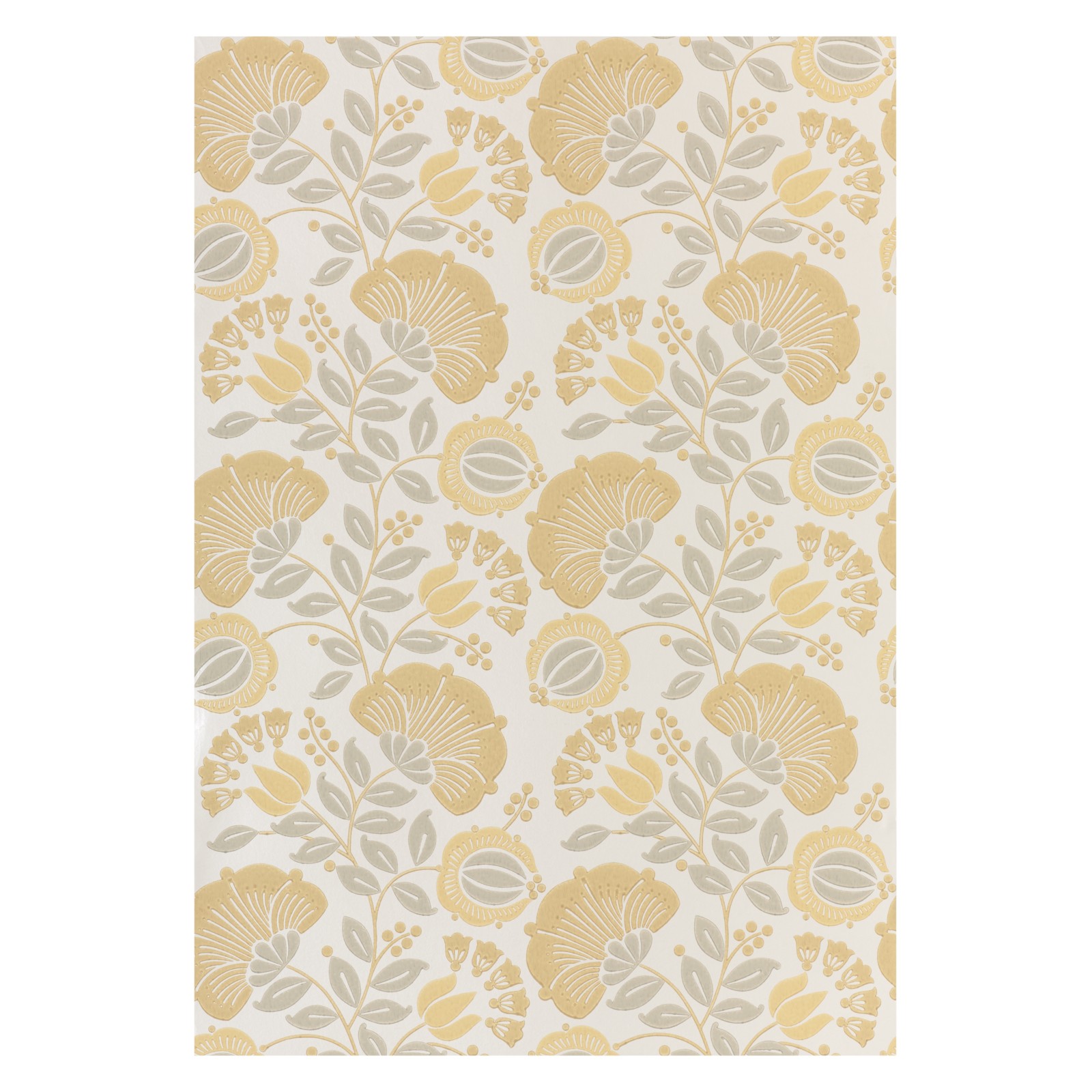Description: A yellow and grey floral wallpaper with leaves and flowers on it's side.