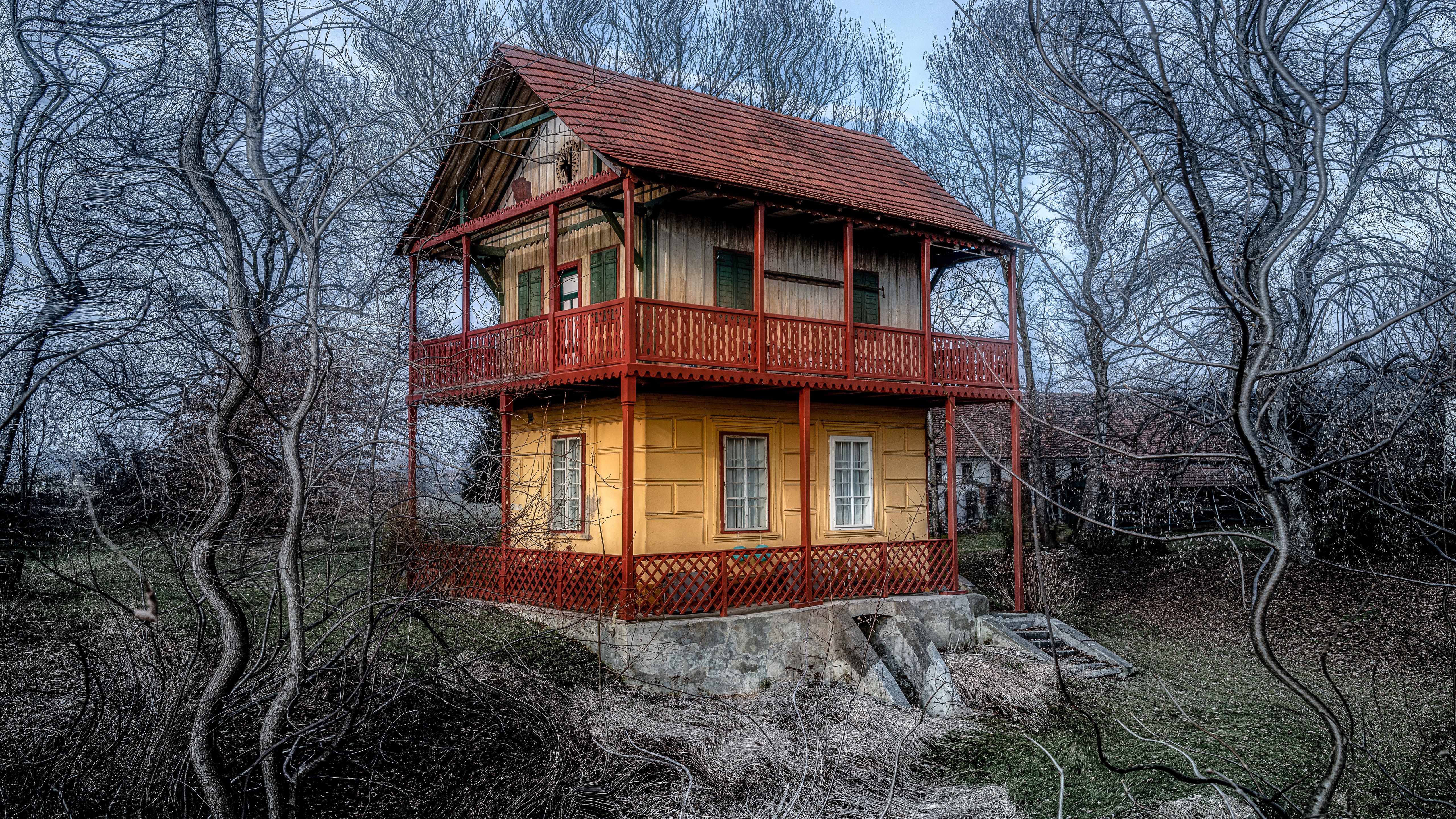 Description: A small yellow and red house in the woods with trees around it and a red roof on top of a small yellow building.