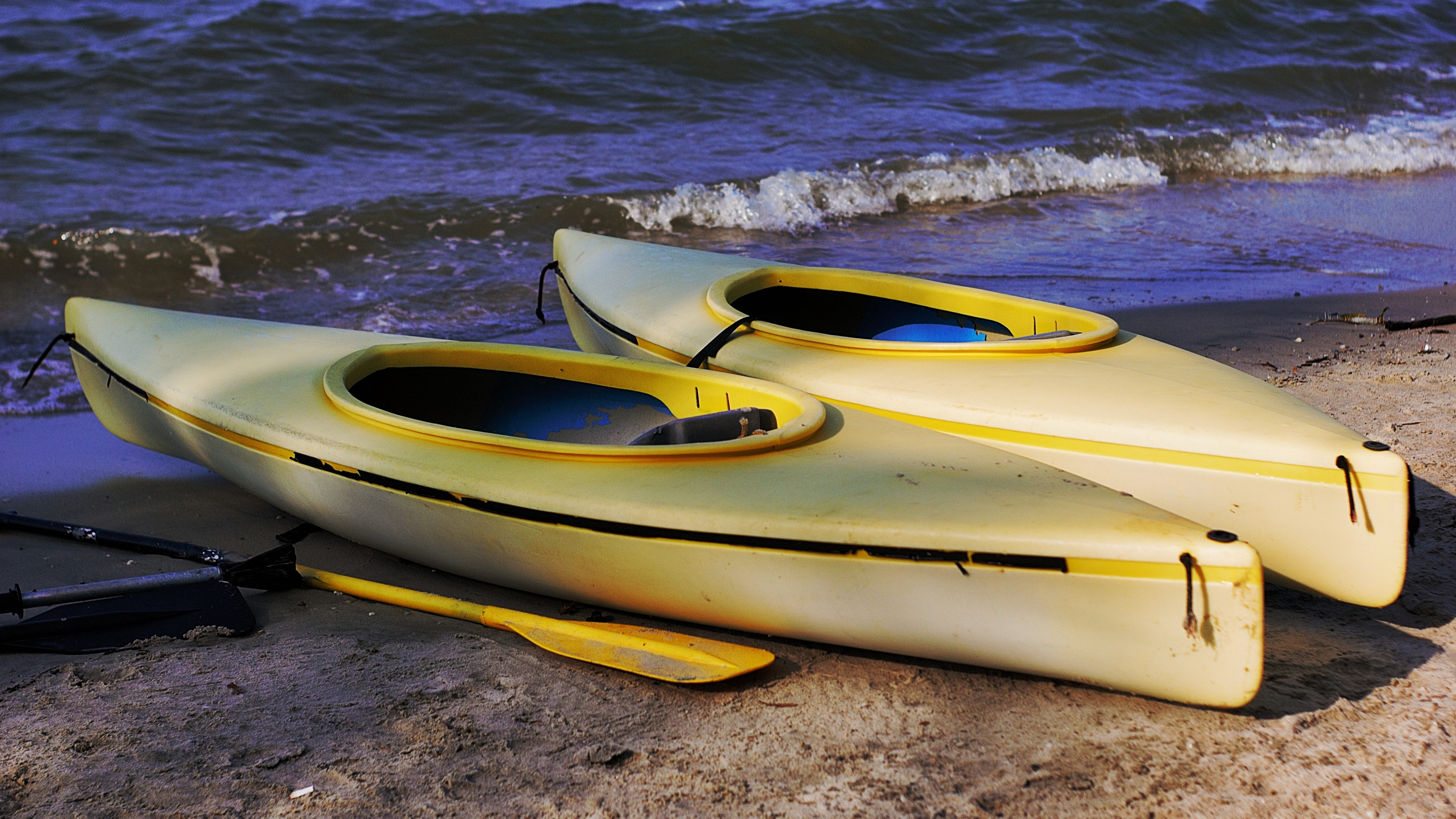 Description: Two yellow kayaks sitting on the beach next to the ocean water and a paddle board with a paddle.