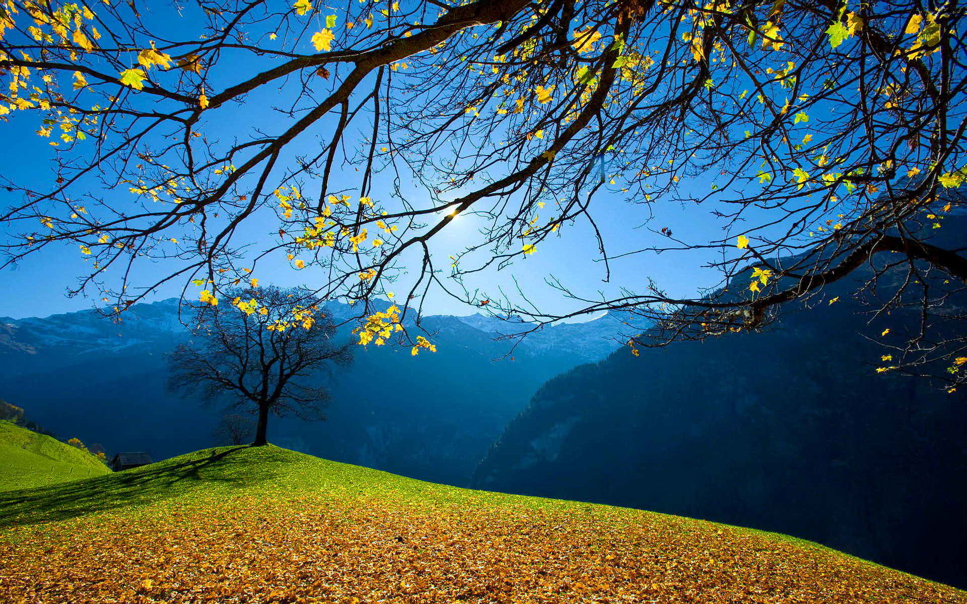 Description: A tree with yellow leaves on a hill with a blue sky in the background and a sun shining through the branches.