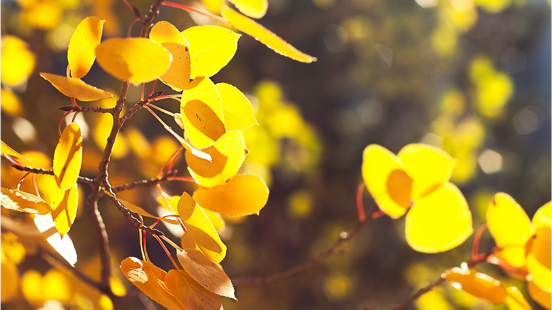 Description: A close up of a tree with yellow leaves and a blurry background of trees in the background with yellow leaves.