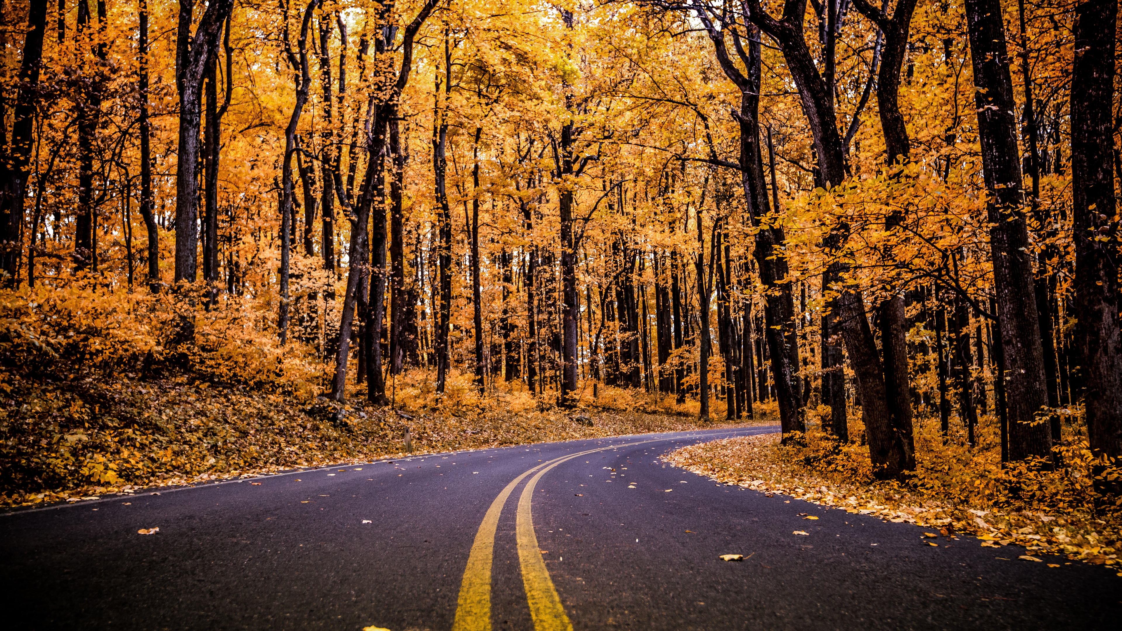 Description: A road with a yellow line in the middle of it surrounded by trees with yellow leaves on the sides.