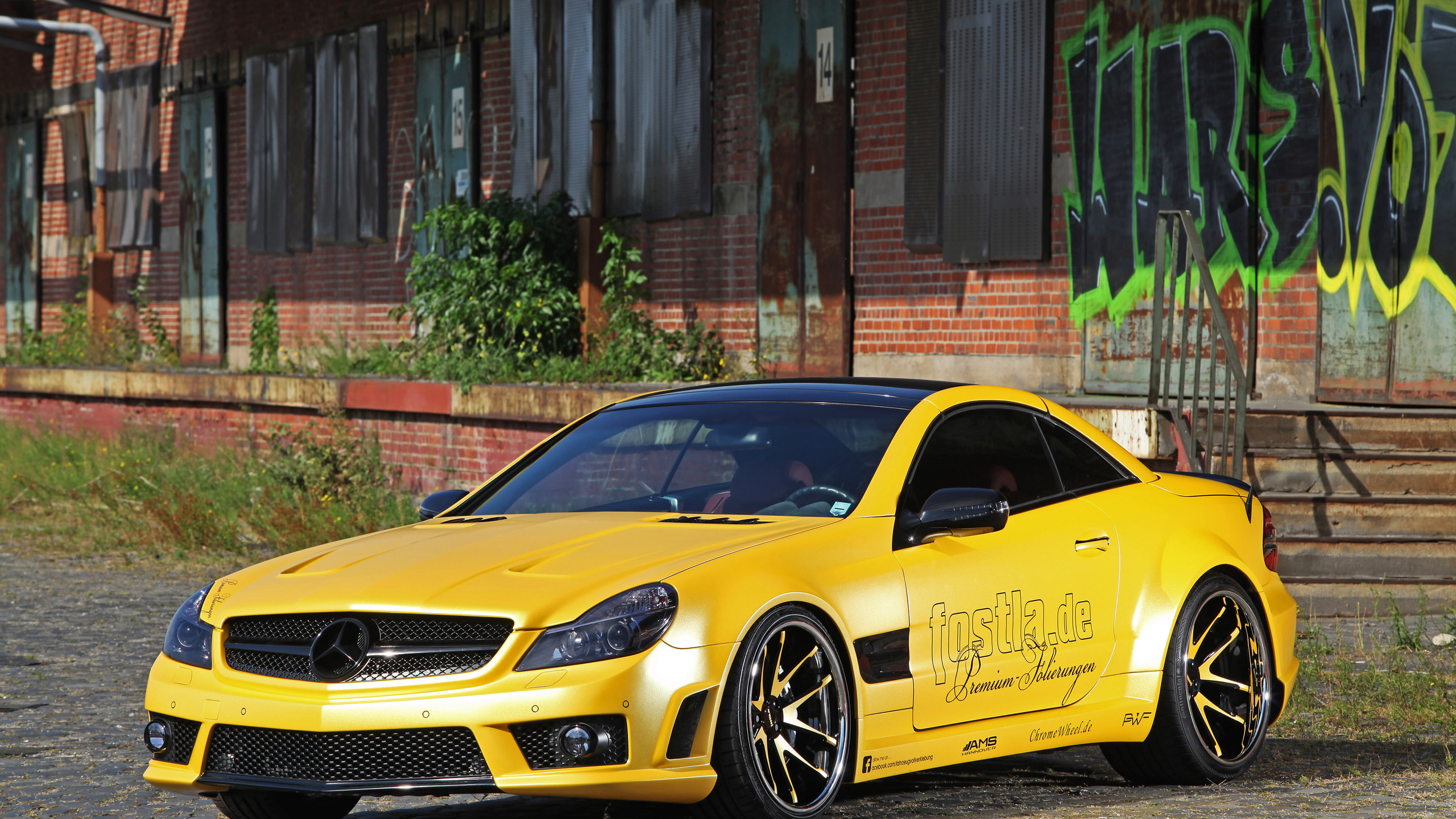 Description: A yellow mercedes sls parked in front of a building with graffiti on it's walls and a staircase.