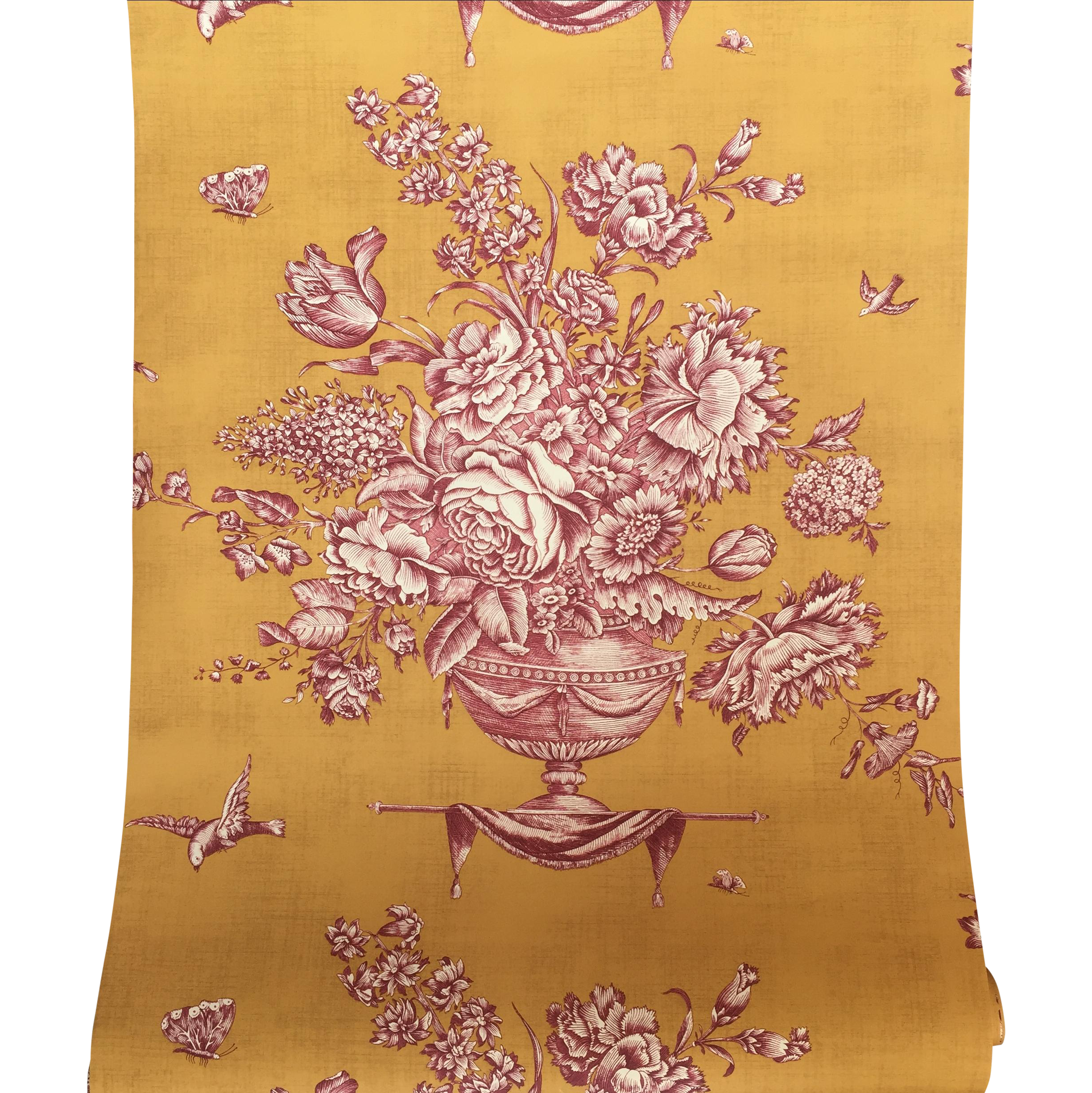 Description: A yellow and pink floral print scarf with a vase of flowers on it.