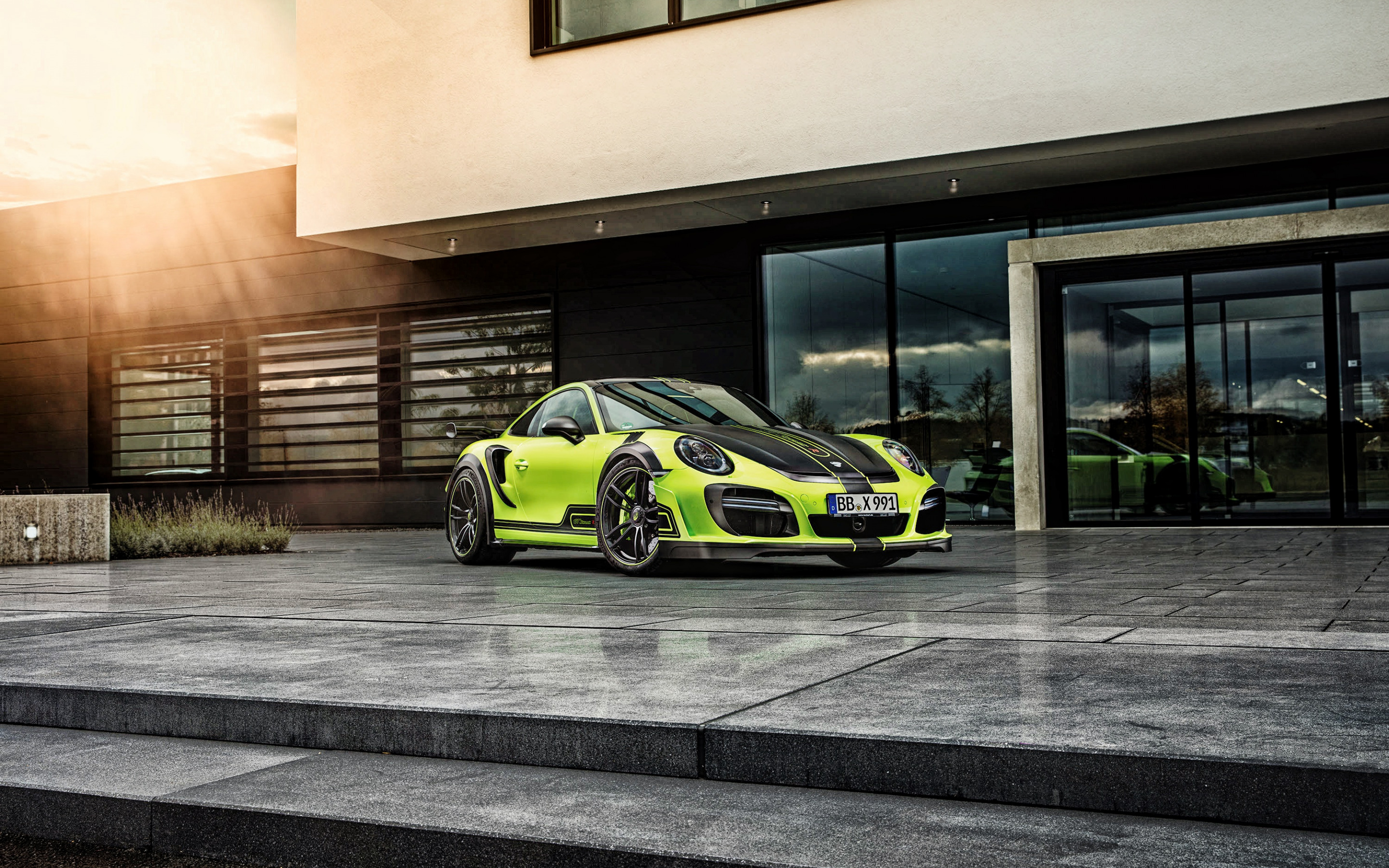 Description: A yellow porsche gtr parked in front of a building with a sunbeam in the background and a set of steps leading up to it.