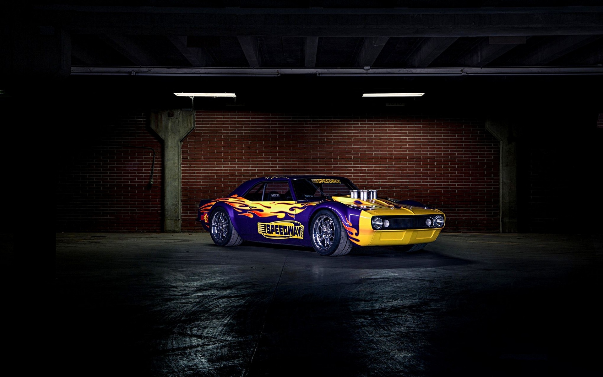 Description: A yellow and purple car in a dark garage with a brick wall behind it and a brick wall behind it.