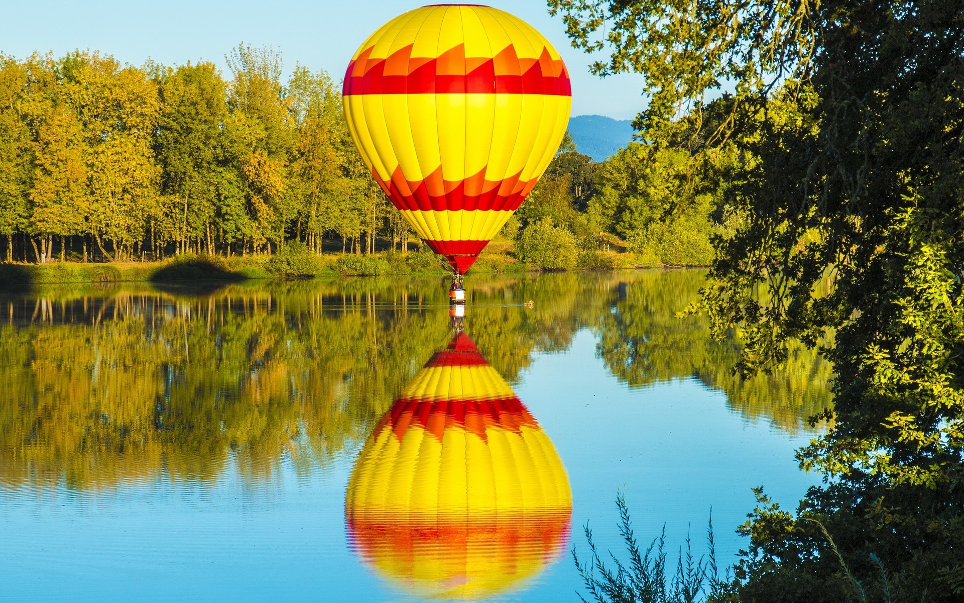 Description: A large yellow and red balloon floating over a lake next to a forest filled with trees and water with a reflection on the water.