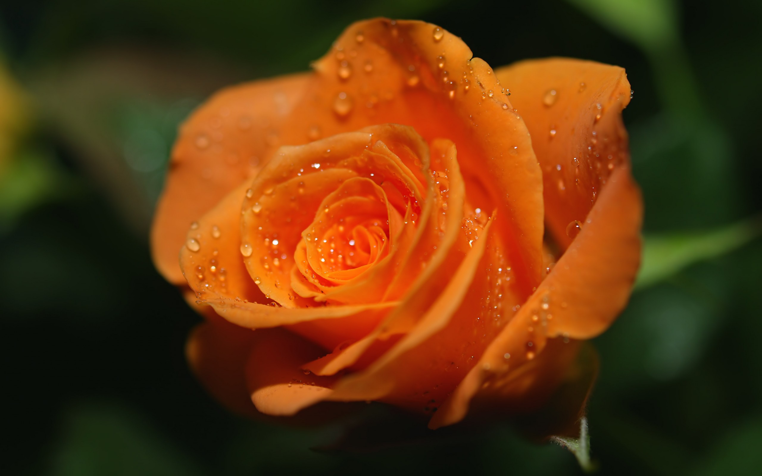 Description: A close up of a yellow rose with water droplets on it's petals and leaves in the background.