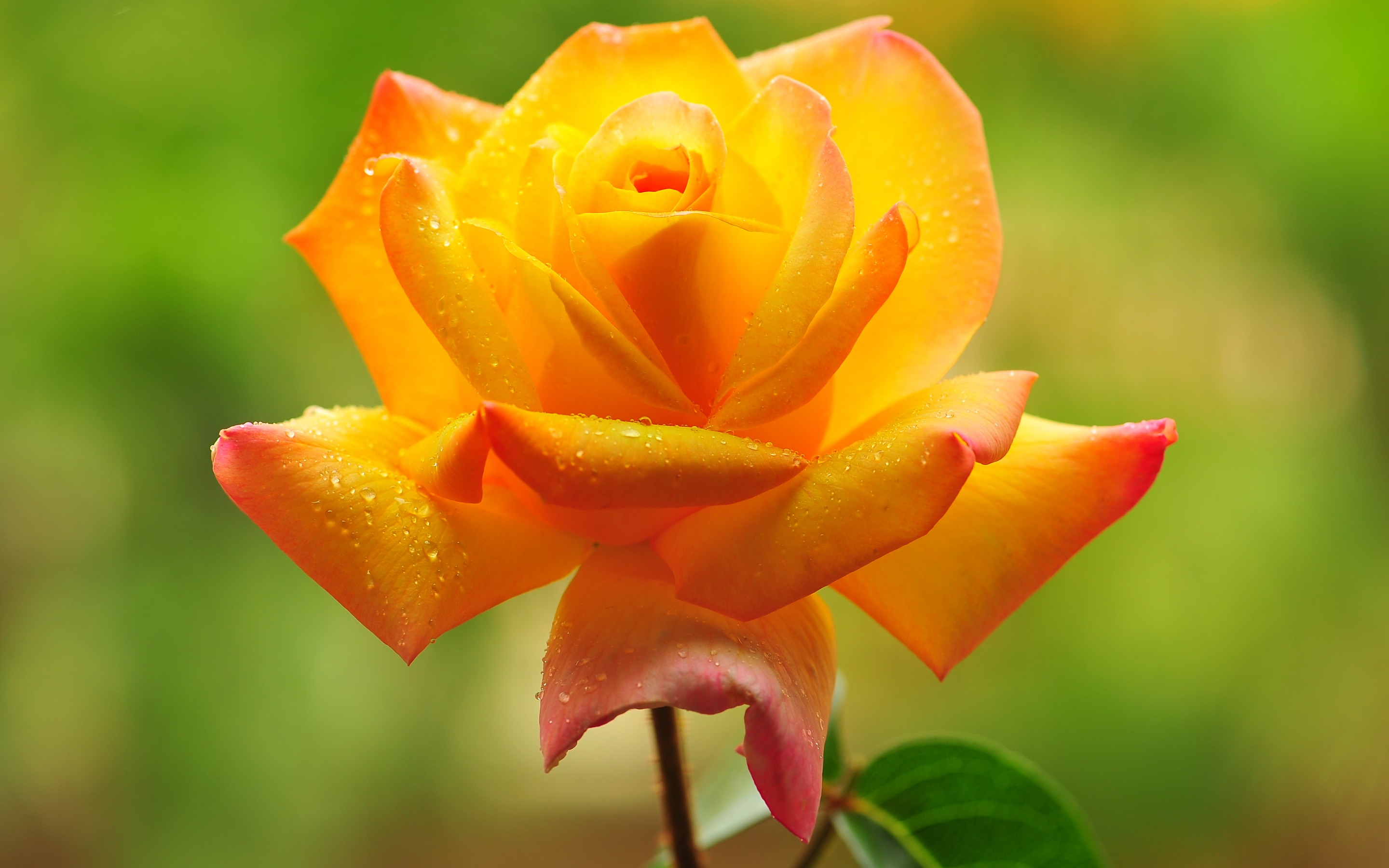 Description: A yellow rose with water droplets on it's petals and leaves in the background.