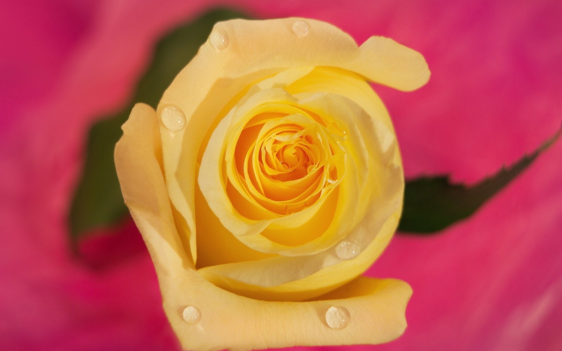 Description: A yellow rose with water droplets on it's petals and a green leaf on the top of it.