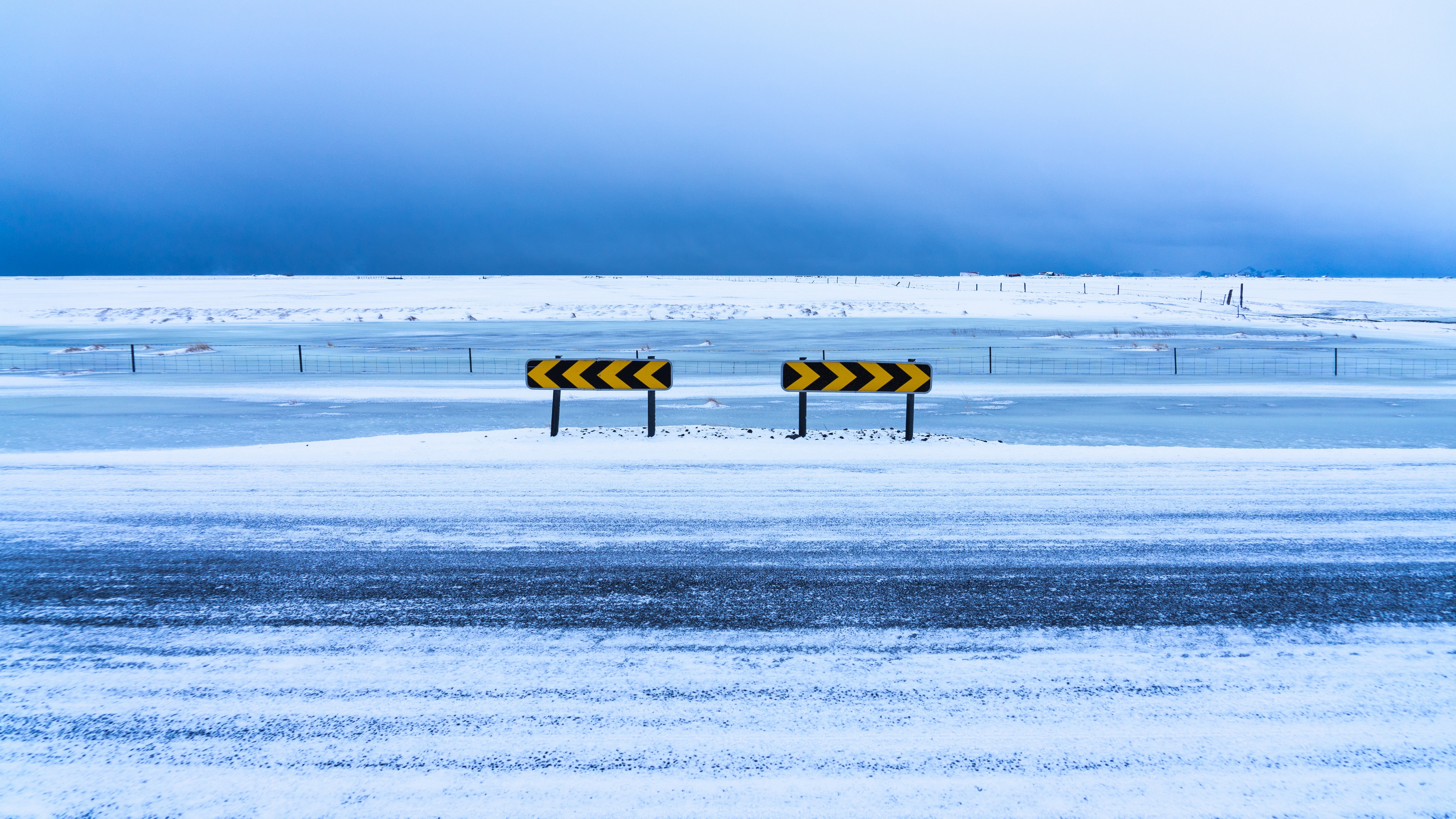 Description: A couple of yellow signs sitting on top of a snow covered field next to a road sign in the snow.