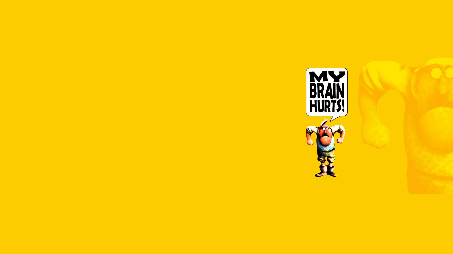 Description: A yellow background with a cartoon character holding a sign that says my brain hates on it's face.