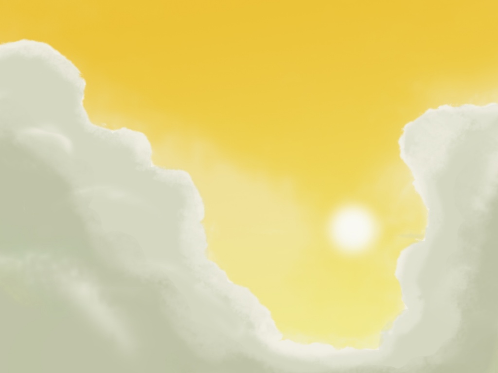 Description: A yellow sky with clouds and a plane flying in the sky with a sun in the background and a yellow sky.