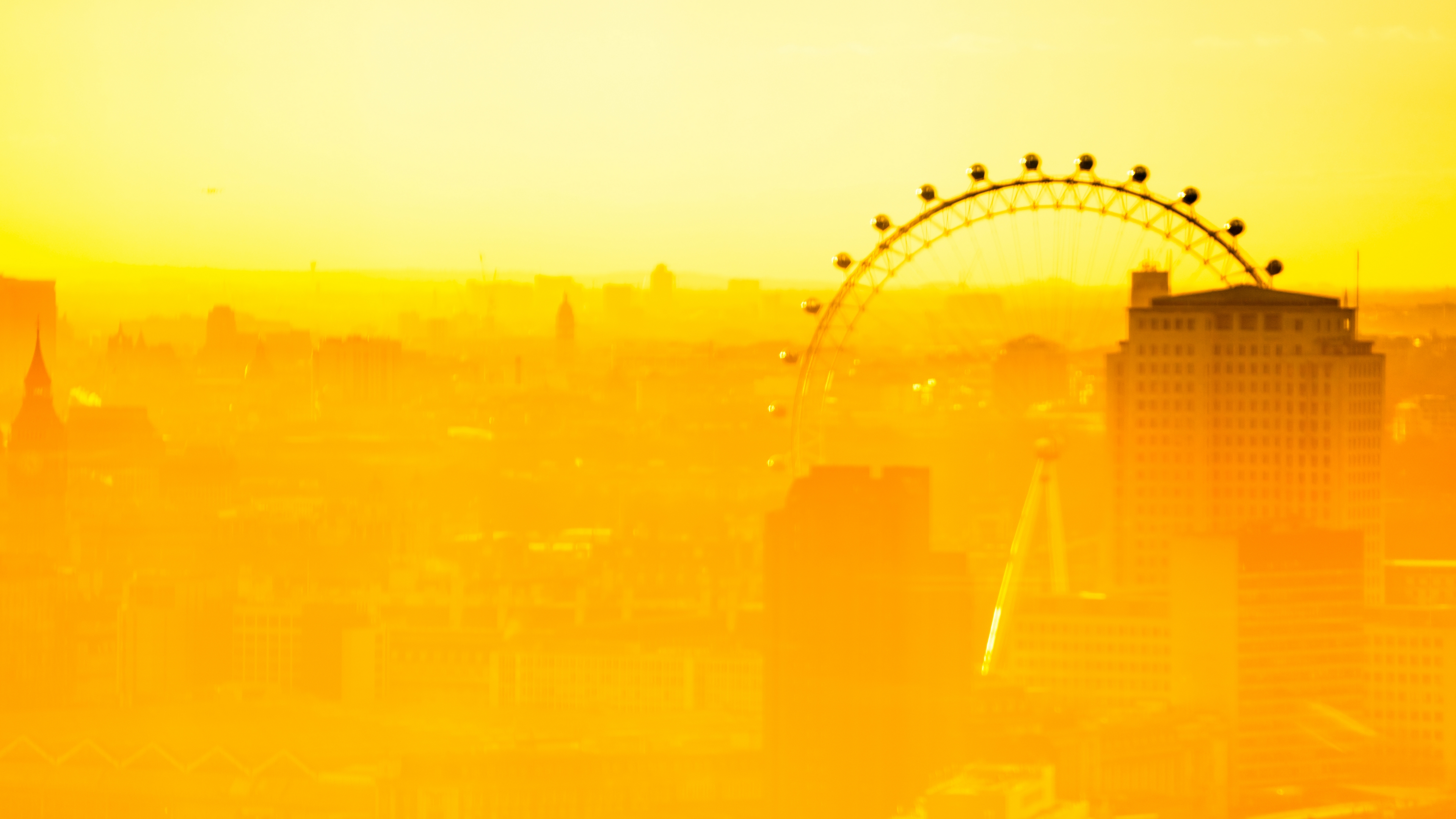 Description: A yellow sky with a ferris wheel in the background and a city skyline in the foreground with a ferris wheel in the distance.
