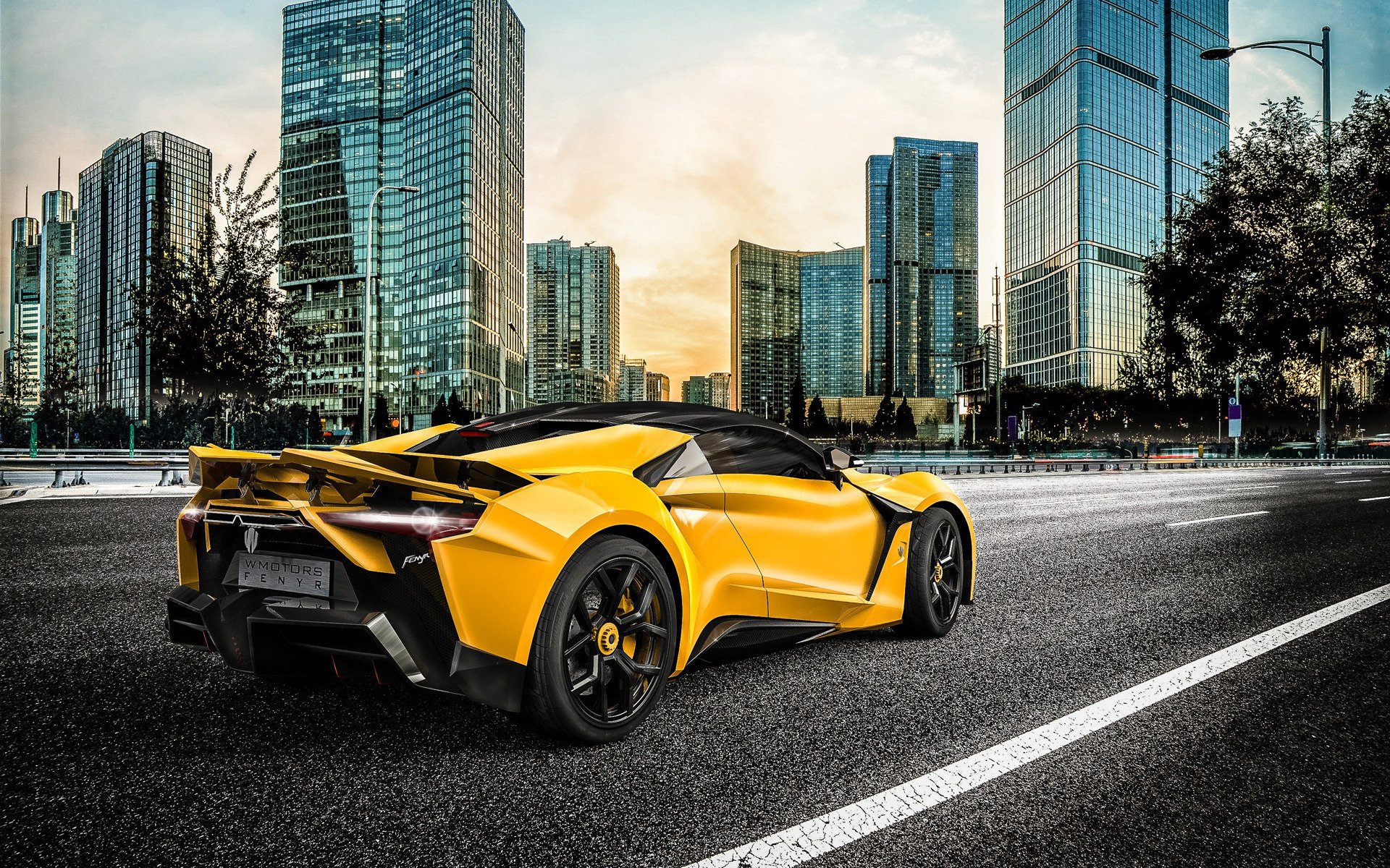 Description: A yellow sports car driving down a city street with tall buildings in the background and a cloudy sky in the foreground.