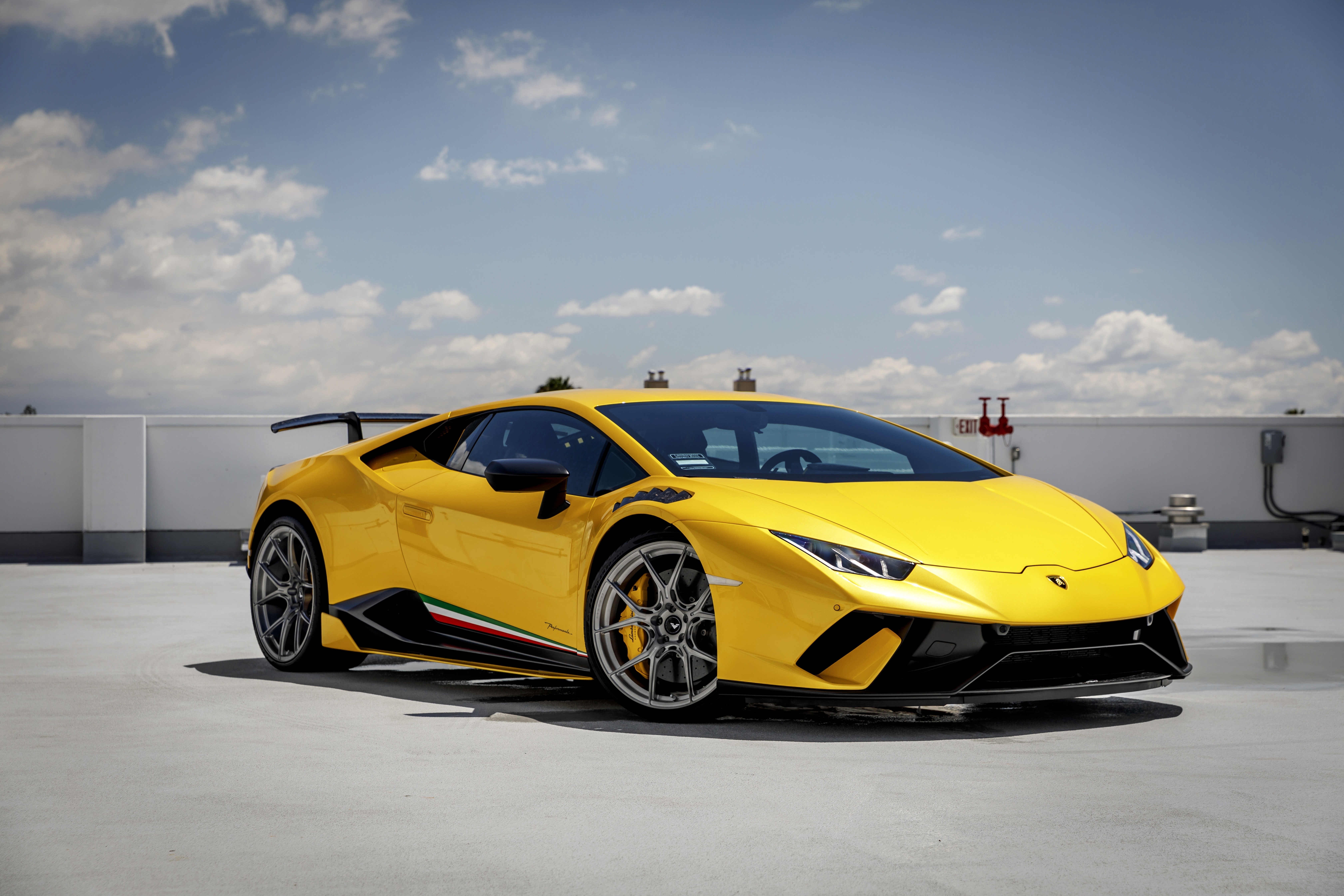 Description: A yellow sports car parked on a parking lot with a sky background and clouds in the background.