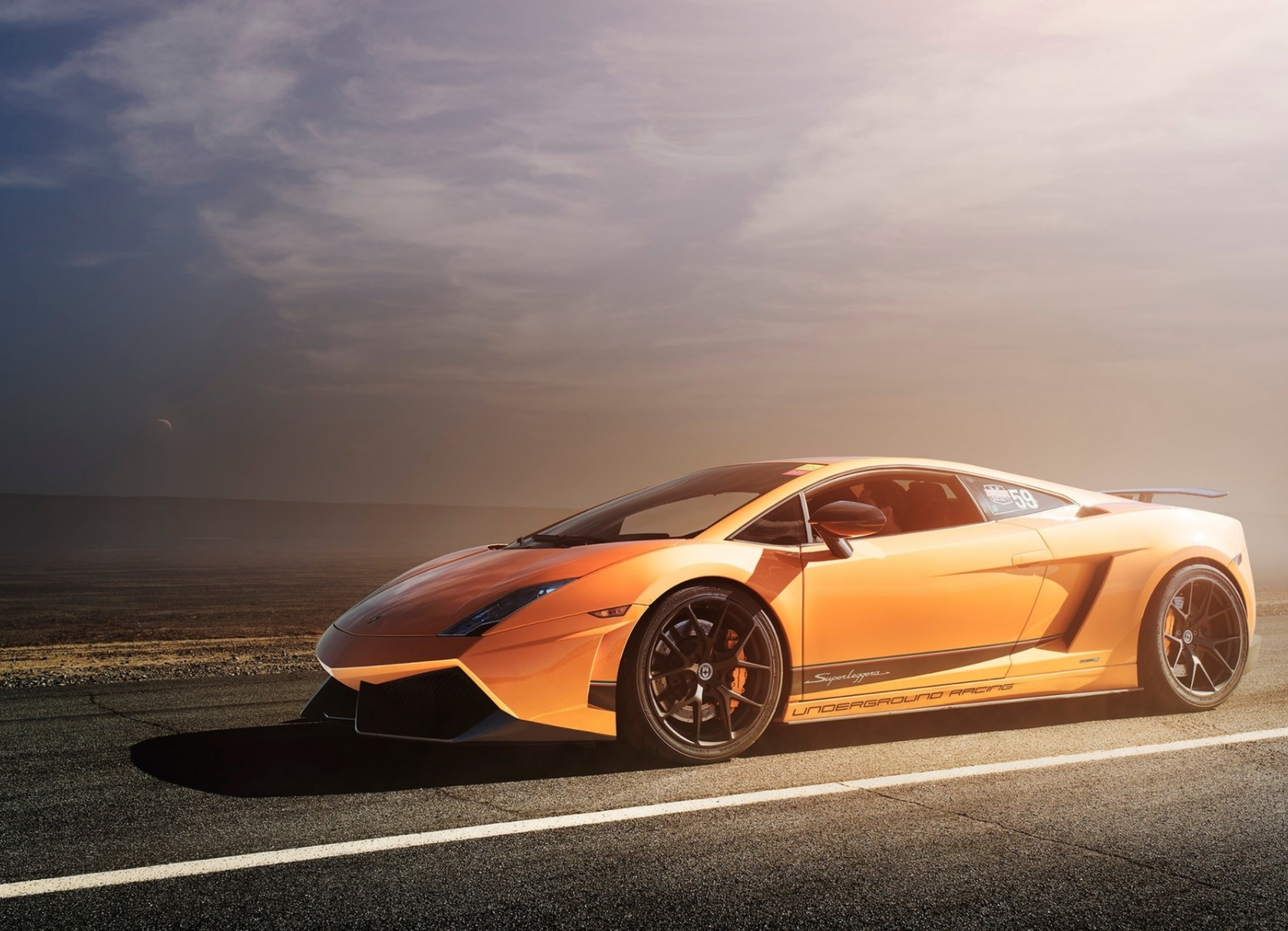 Description: A yellow sports car driving down a road under a cloudy sky with a sunbeam in the background and a few clouds in the sky.