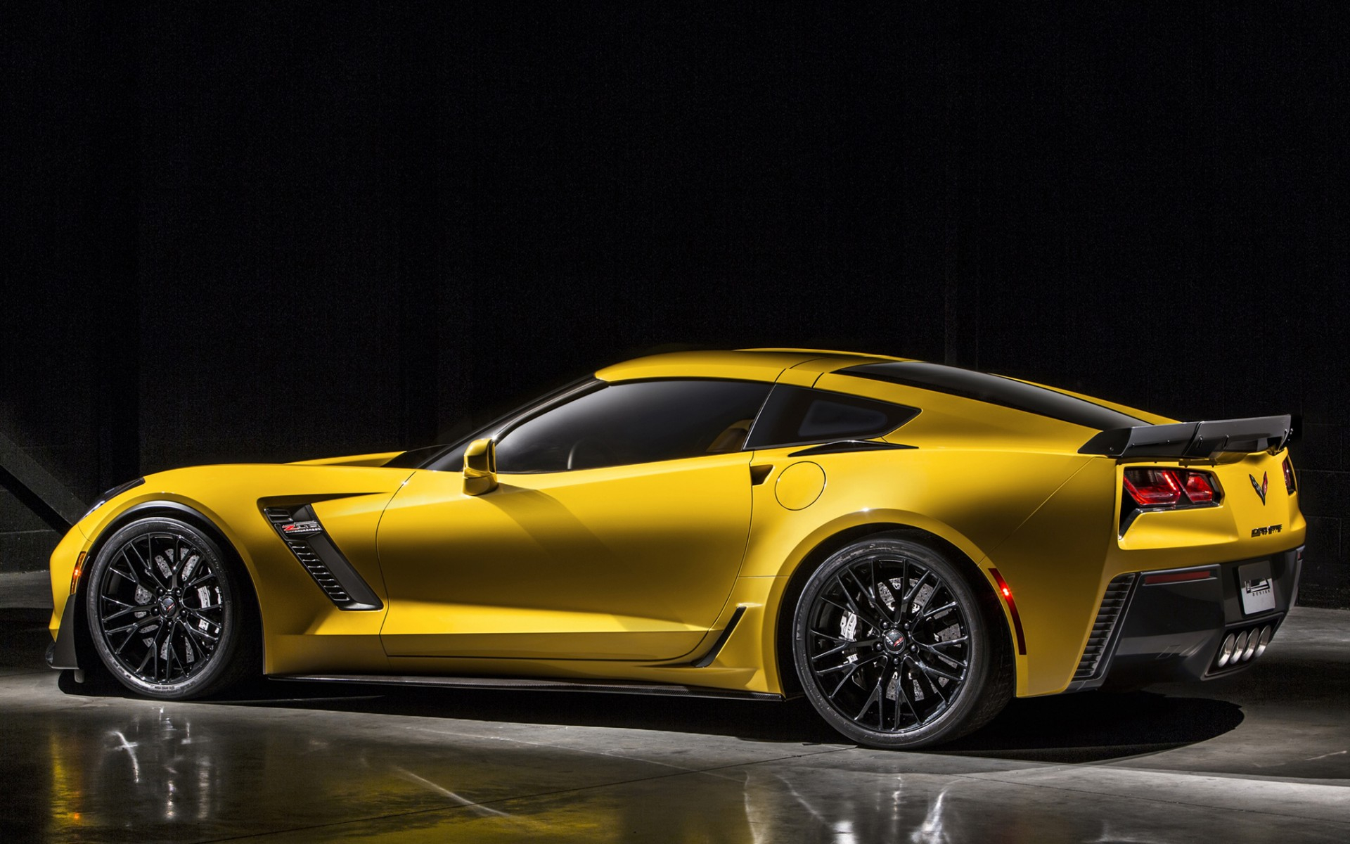 Description: A yellow sports car parked in a dark room with a black background and a spotlight on the floor behind it.