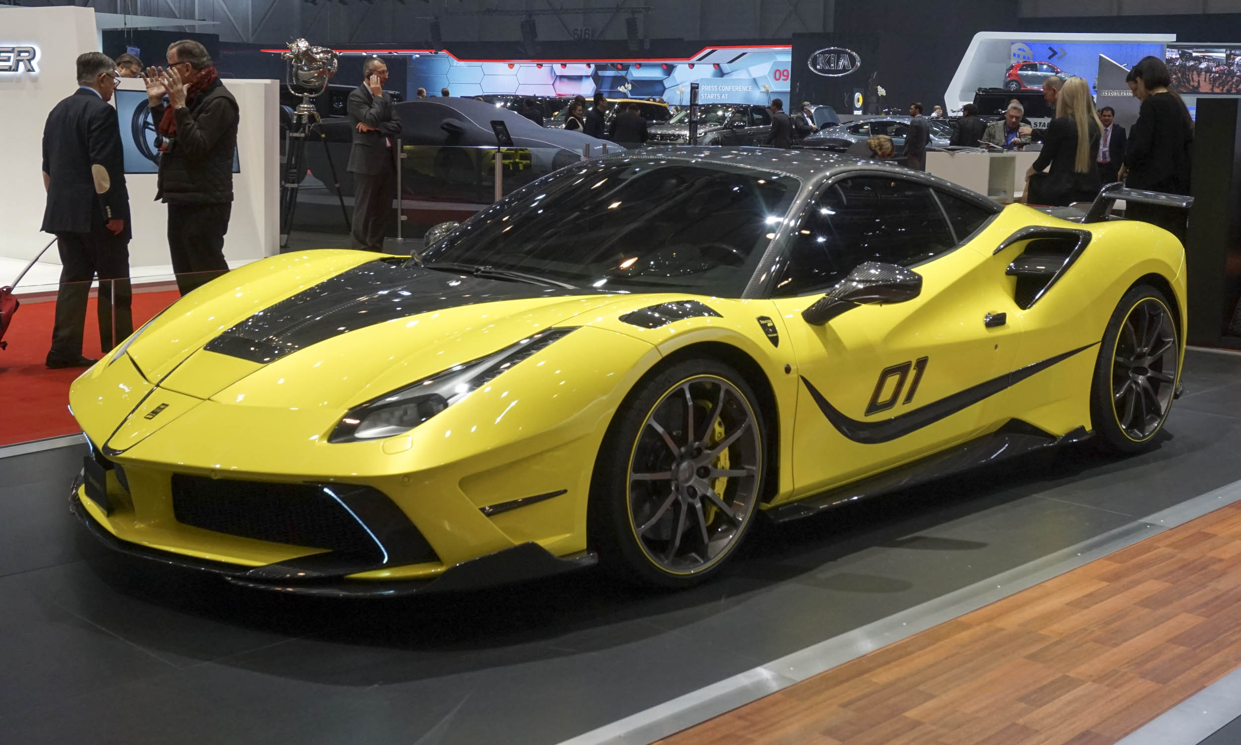 Description: A yellow sports car on display at a car show with people looking around it and a man standing next to it.