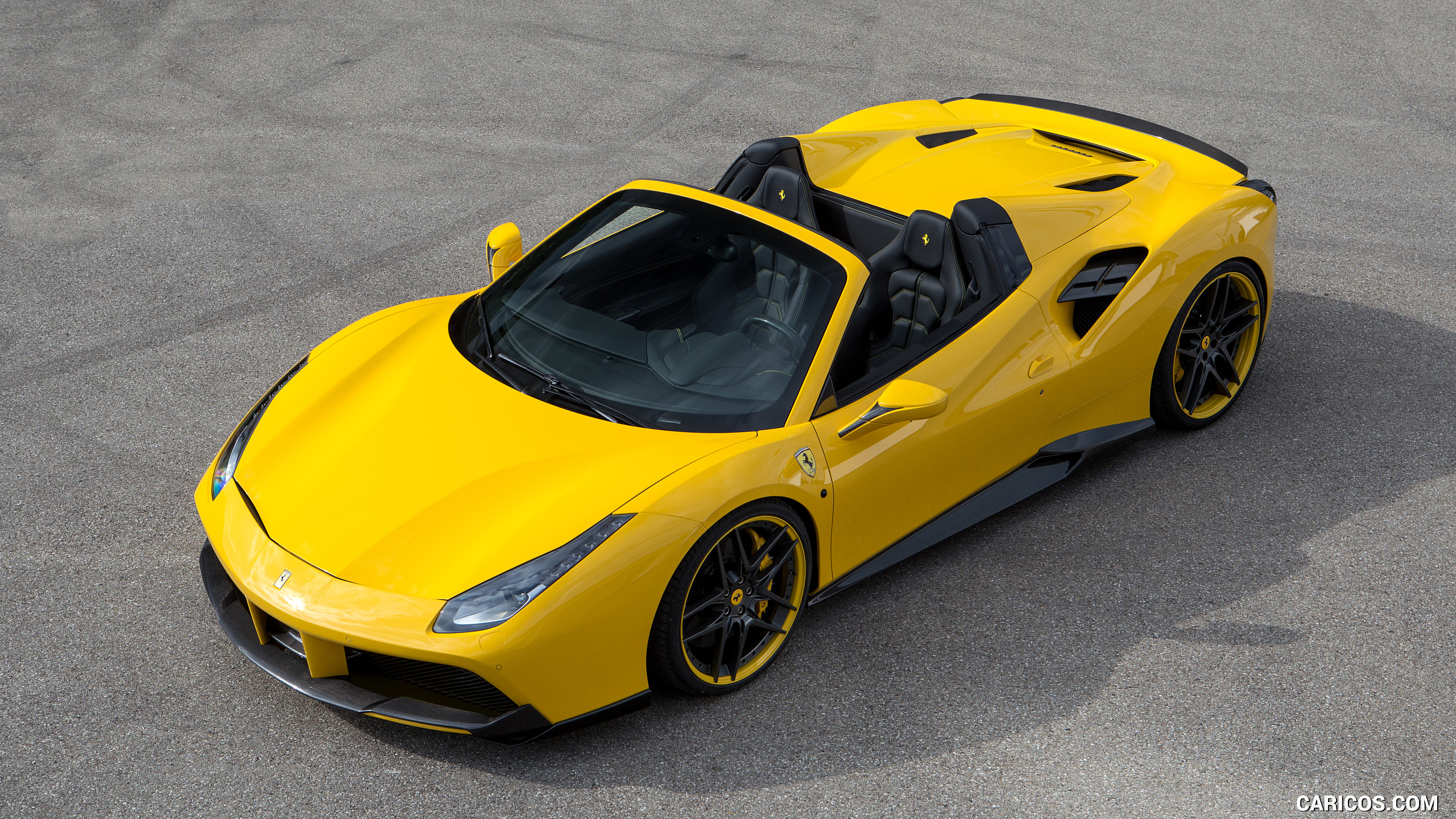 Description: A yellow sports car driving on a road with a roof down and a black top down on the front.