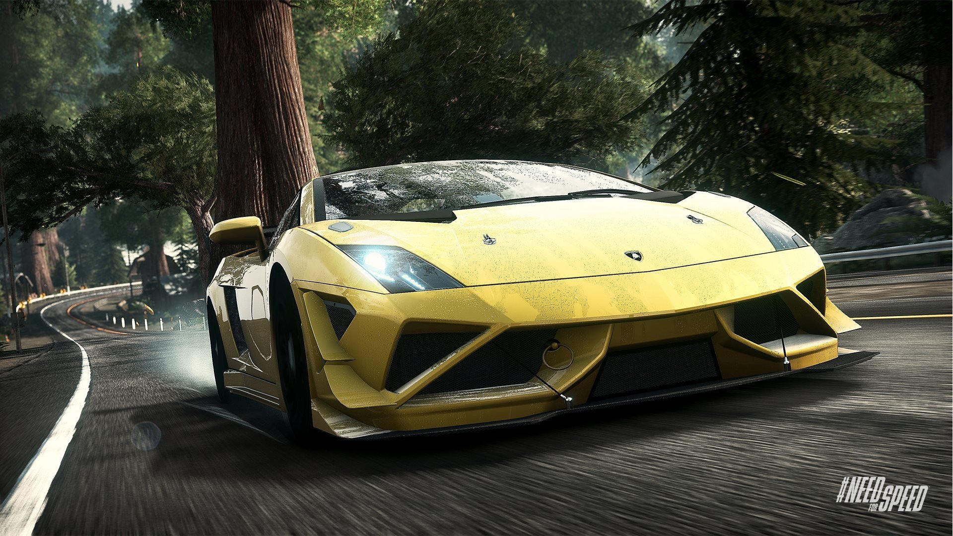 Description: A yellow sports car driving down a road next to a tree filled forest in a video game environment with a person standing in the front of the car.