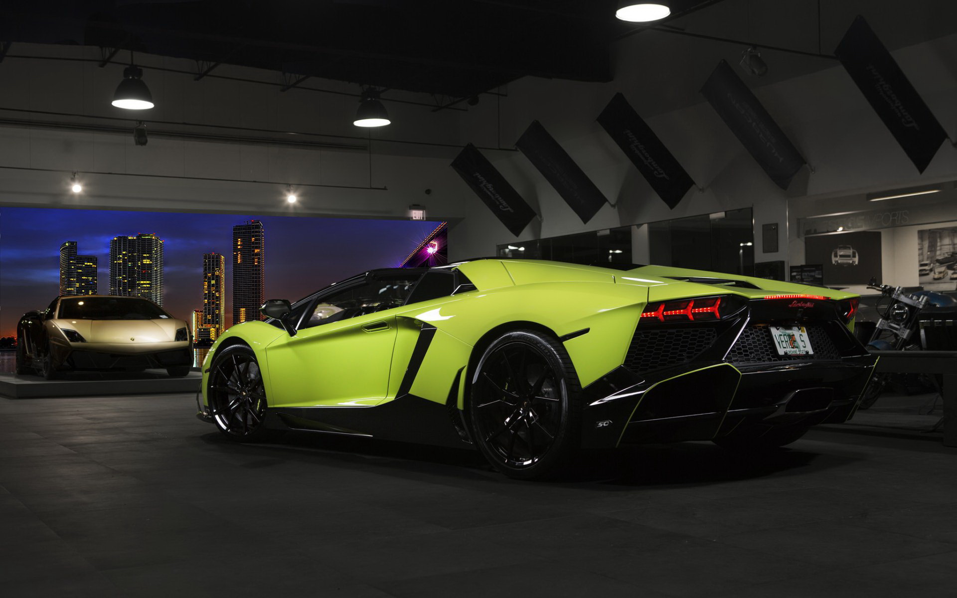 Description: A yellow sports car parked in a garage next to a white car and a black car in the background.