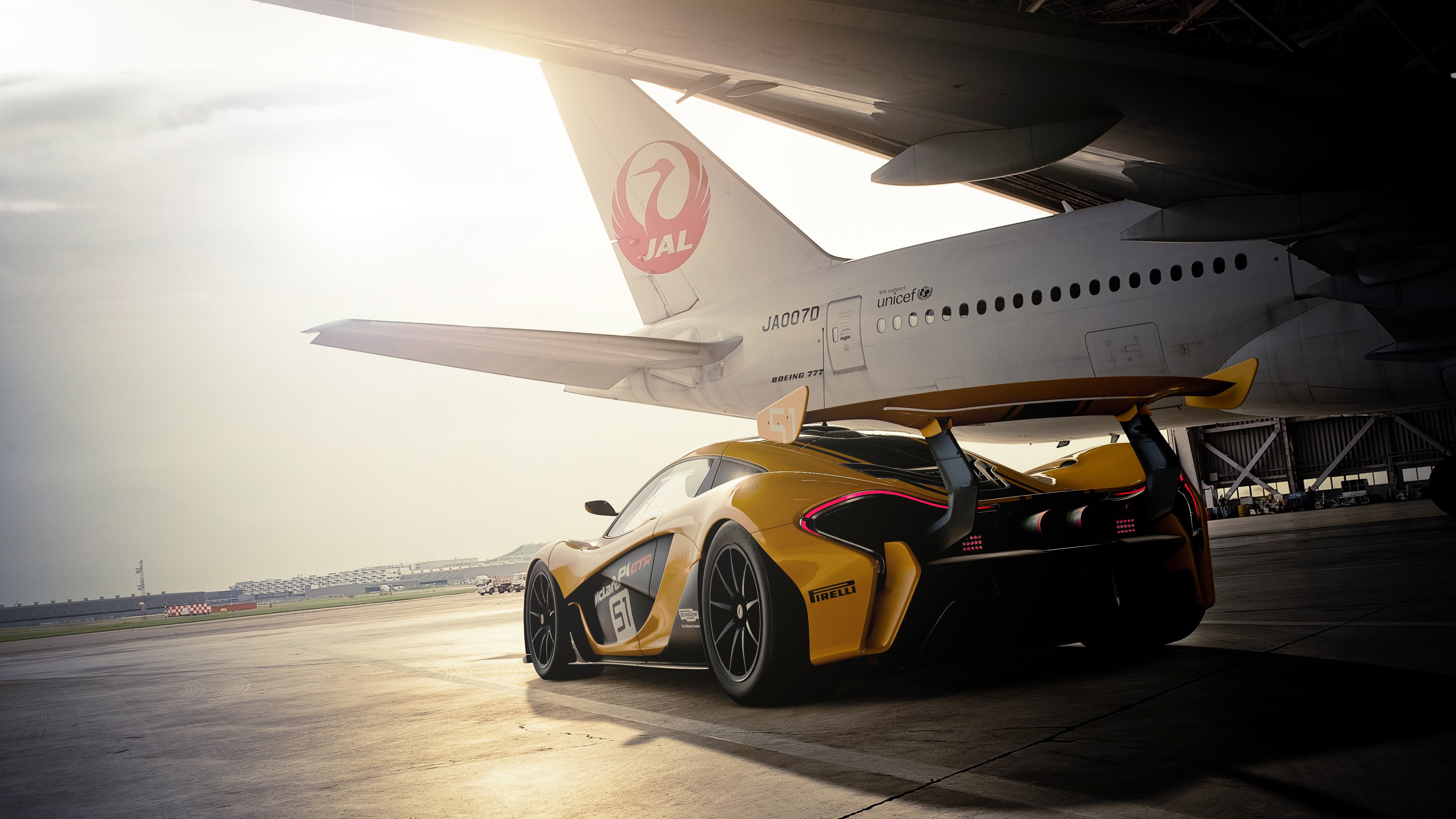 Description: A yellow sports car parked in front of a jet airplane on a runway with the sun shining through the clouds.