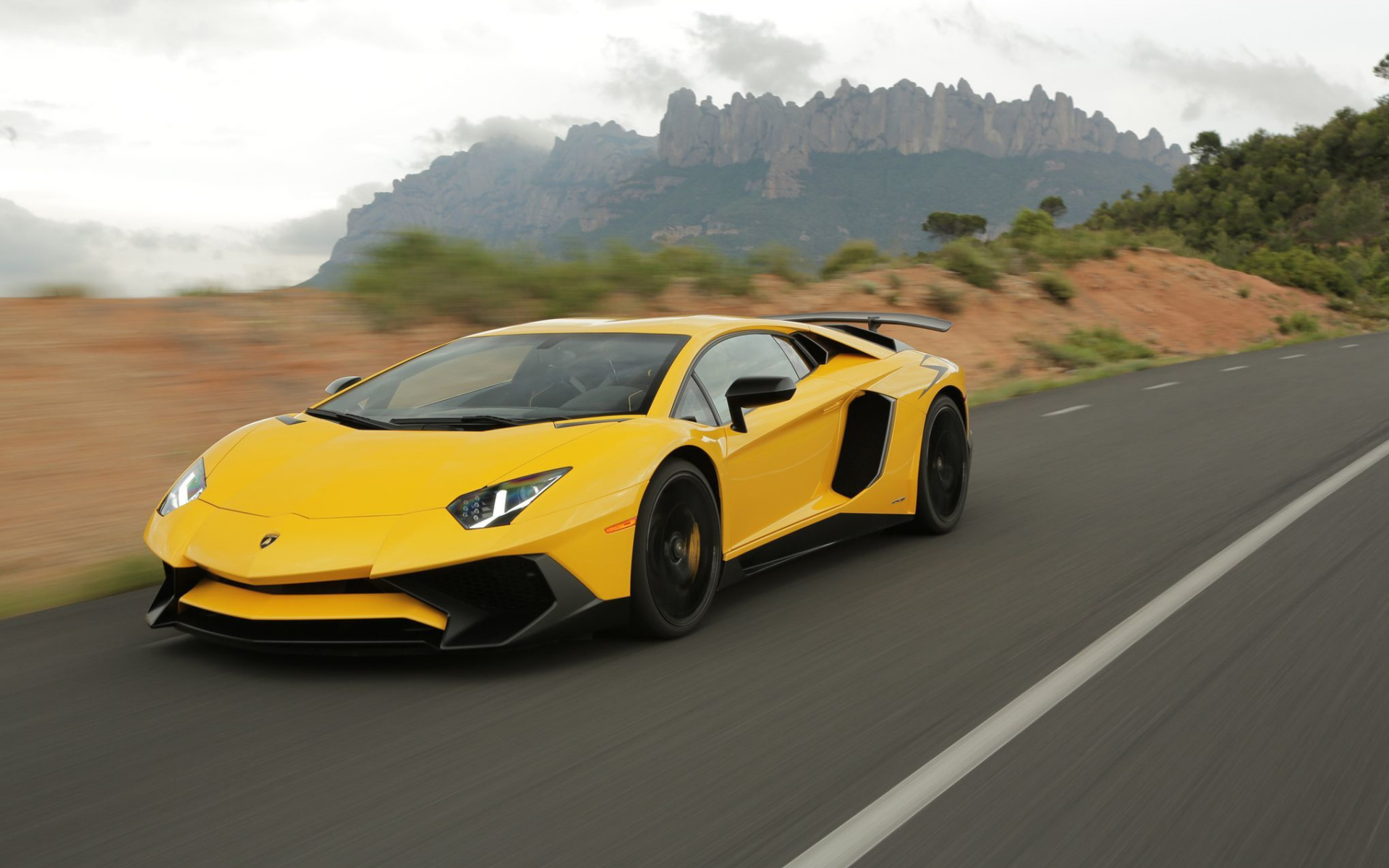 Description: A yellow sports car driving down a road near mountains and trees in the background with a cloudy sky above.